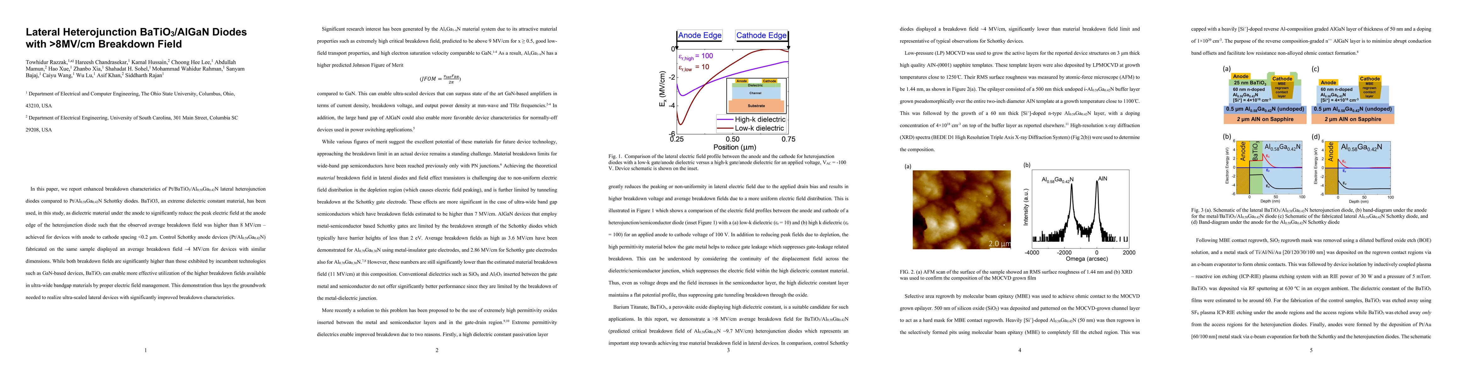 This paper reports on the enhanced breakdown characteristics of Pt/BaTiO3/AlGaN lateral heterojunction diodes, achieving an average breakdown field of over 8 MV/cm, significantly higher than the 4 MV/cm observed in control Schottky diodes. The use of BaTiO3 as a dielectric material helps manage electric fields, paving the way for ultra-scaled devices with superior breakdown performance.