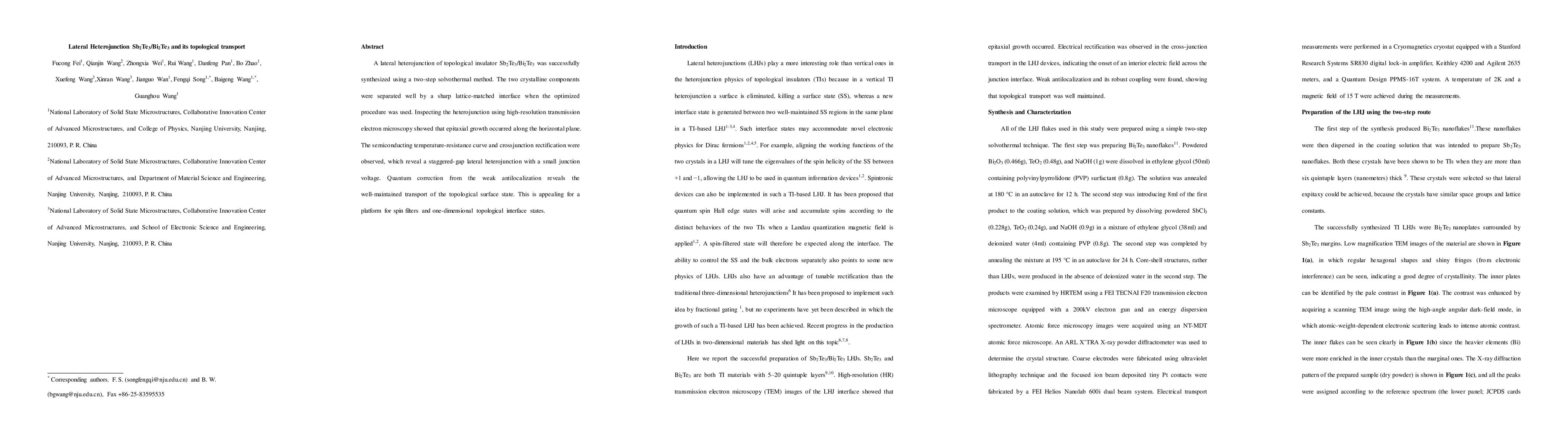 A lateral heterojunction of topological insulator Sb2Te3/Bi2Te3 was successfully synthesized using a two-step solvothermal method. The two crystalline components were separated well by a sharp lattice-matched interface when the optimized procedure was used. Inspecting the heterojunction using high-resolution transmission electron microscopy showed that epitaxial growth occurred along the horizontal plane. A rectification curve was observed at low temperatures. Quantum correction from the weak antilocalization reveals the transport of the topological surface state. There was, therefore, a staggered-gap lateral heterojunction with a small junction voltage, which is appealing for a platform for spin filters and one-dimensional topological interface states.