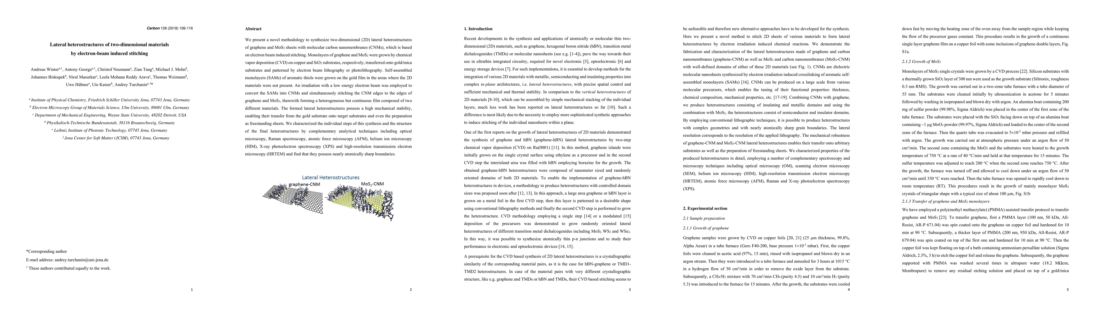 This research develops a novel method for synthesizing lateral heterostructures of graphene and MoS2 using electron beam-induced stitching, showing high mechanical stability and nearly atomically sharp boundaries, validated by various analytical techniques. The technique involves transferring 2D materials onto gold substrates and forming carbon nanomembranes to stitch the materials together.