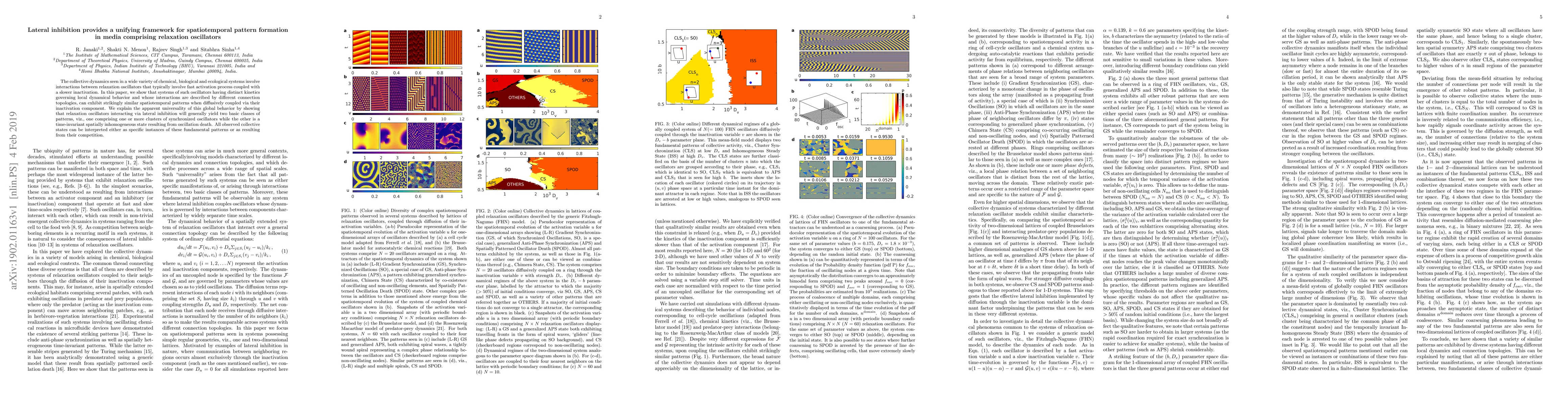 This paper demonstrates that lateral inhibition among relaxation oscillators, characterized by fast activation and slow inactivation, can unify spatiotemporal pattern formation across chemical, biological, and ecological systems. It reveals that diverse oscillators with different kinetics and connection topologies can produce similar patterns when coupled via their inactivation, leading to clusters of synchronized oscillators or oscillation death.