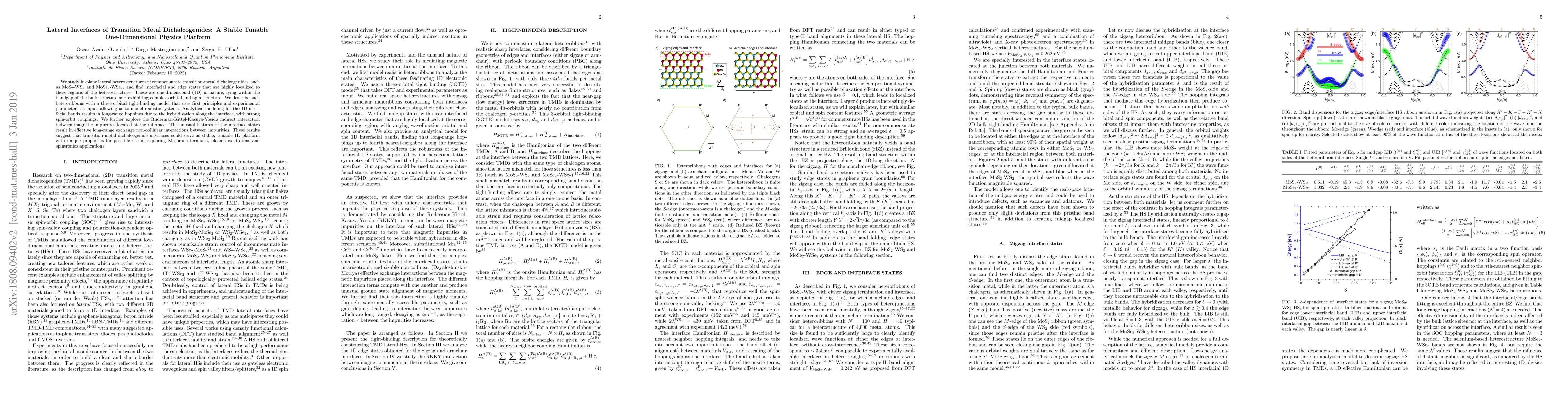 We study in-plane lateral heterostructures of commensurate transition-metal dichalcogenides, such as MoS$_{2}$-WS$_{2}$ and MoSe$_{2}$-WSe$_{2}$, and find interfacial and edge states that are highly localized to these regions of the heterostructure. These are one-dimensional (1D) in nature, lying within the bandgap of the bulk structure and exhibiting complex orbital and spin structure. We describe such heteroribbons with a three-orbital tight-binding model that uses first principles and experimental parameters as input, allowing us to model realistic systems. Analytical modeling for the 1D interfacial bands results in long-range hoppings due to the hybridization along the interface, with strong spin-orbit couplings. We further explore the Ruderman-Kittel-Kasuya-Yosida indirect interaction between magnetic impurities located at the interface. The unusual features of the interface states result in effective long-range exchange non-collinear interactions between impurities. These results suggest that transition-metal dichalcogenide interfaces could serve as stable, tunable 1D platform with unique properties for possible use in exploring Majorana fermions, plasma excitations and spintronics applications.