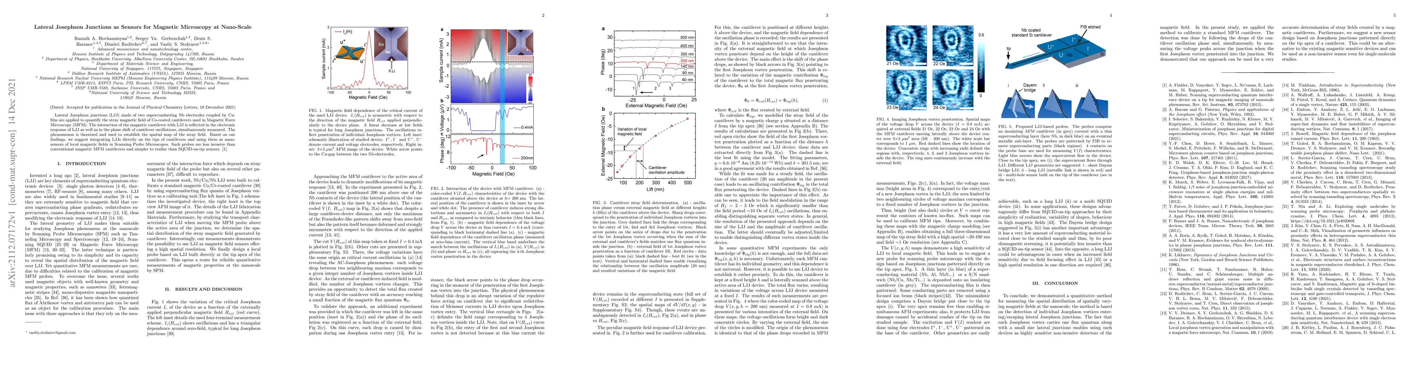 Lateral Josephson junctions (LJJ) made of two superconducting Nb electrodes coupled by Cu-film are applied to quantify the stray magnetic field of Co-coated cantilevers used in Magnetic Force Microscopy (MFM). The interaction of the magnetic cantilever with LJJ is reflected in the electronic response of LJJ as well as in the phase shift of cantilever oscillations, simultaneously measured. The phenomenon is theorized and used to establish the spatial map of the stray field. Based on our findings, we suggest integrating LJJs directly on the tips of cantilevers and using them as nano-sensors of local magnetic fields in Scanning Probe Microscopes. Such probes are less invasive than conventional magnetic MFM cantilevers and simpler to realize than SQUID-on-tip sensors.