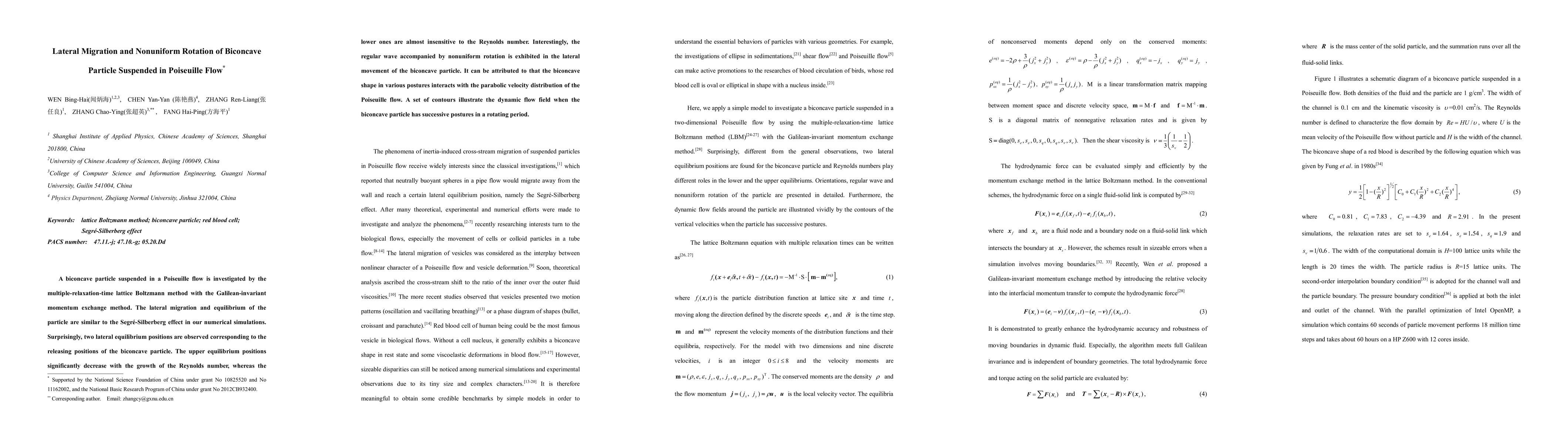 This study uses the lattice Boltzmann method to simulate the lateral migration and rotation of a biconcave particle in Poiseuille flow, revealing two distinct equilibrium positions and a nonuniform rotational pattern influenced by the particle's shape and the flow's parabolic velocity profile. The upper equilibrium position diminishes with increasing Reynolds number, while the lower one remains relatively stable.