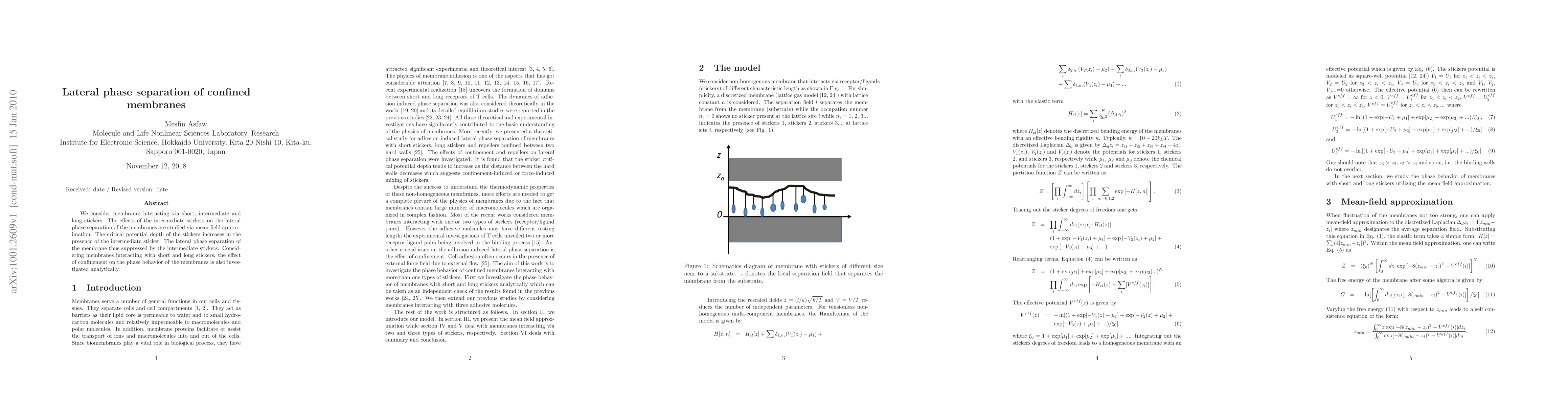 We consider membranes interacting via short, intermediate and long stickers. The effects of the intermediate stickers on the lateral phase separation of the membranes are studied via mean-field approximation. The critical potential depth of the stickers increases in the presence of the intermediate sticker. The lateral phase separation of the membrane thus suppressed by the intermediate stickers. Considering membranes interacting with short and long stickers, the effect of confinement on the phase behavior of the membranes is also investigated analytically.