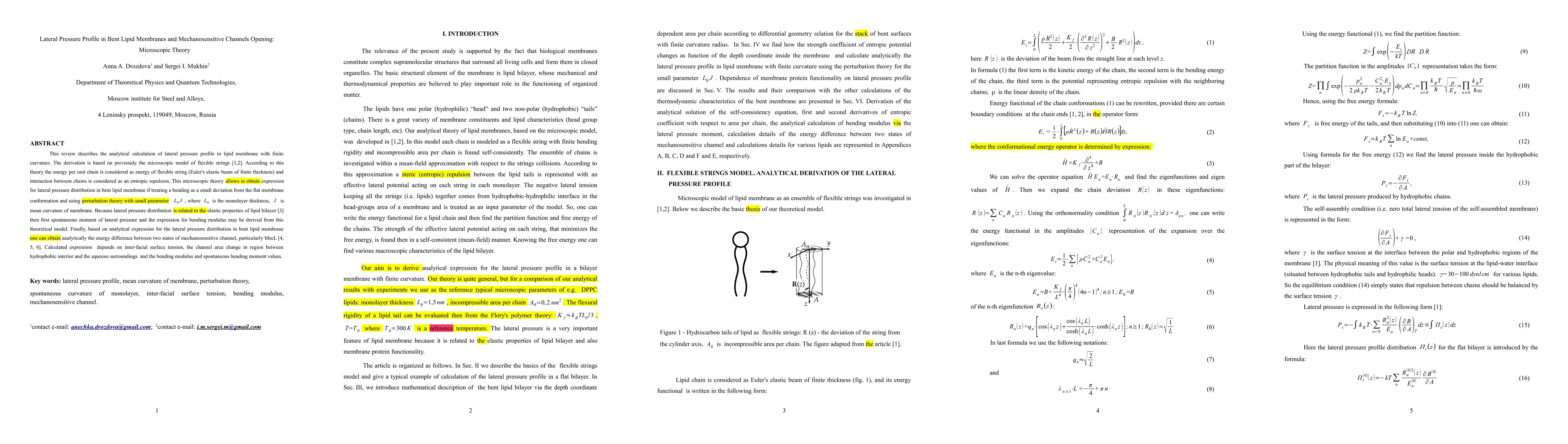 This review describes the analytical calculation of lateral pressure profile in lipid membrane with finite curvature. The derivation is based on the previously developed microscopic model of flexible strings [1,2]. According to this theory the energy per unit chain is considered as energy of flexible string (Euler's elastic beam of finite thickness) and interaction between chains is considered as an entropic repulsion. This microscopic theory allows to obtain expression for lateral pressure distribution in bent lipid membrane if treating a bending as a small deviation from the flat membrane conformation and using perturbation theory with small parameter L0J, where L0 is the monolayer thickness, J is mean curvature of membrane. Because lateral pressure distribution is related to the elastic properties of lipid bilayer [3] then first spontaneous moment of lateral pressure and the expression for bending modulus may be derived from this theoretical model. Finally, based on analytical expression for the lateral pressure distribution in bent lipid membrane one can obtain analytically the energy difference between two states of mechanosensitive channel, particularly MscL [4, 5, 6]. Calculated expression depends on inter-facial surface tension, the channel area change in region between hydrophobic interior and the aqueous surroundings and the bending modulus and spontaneous bending moment values.