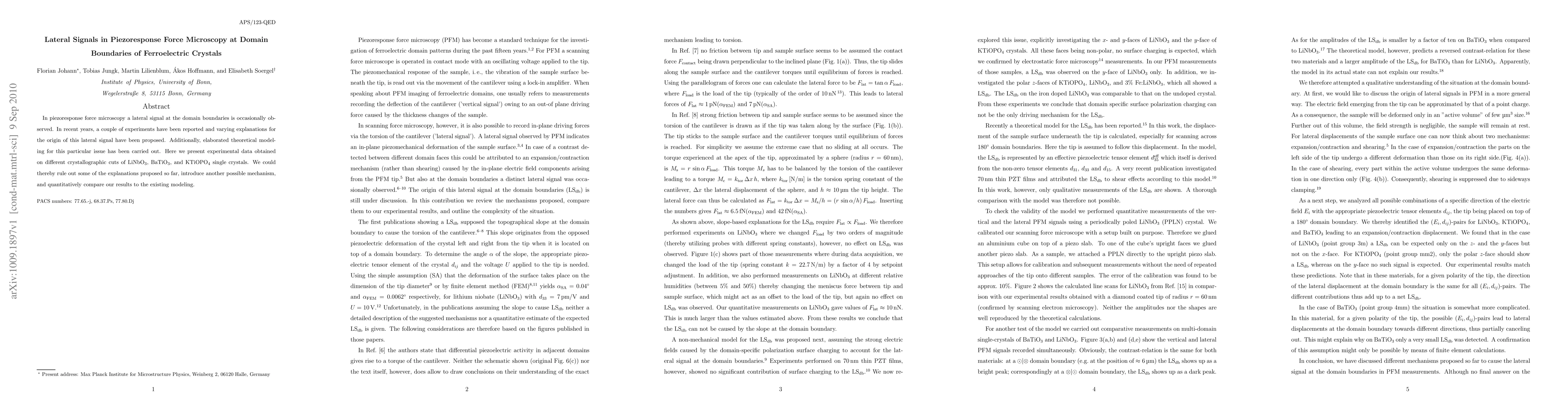 This paper investigates lateral signals observed in piezoresponse force microscopy at domain boundaries in ferroelectric crystals, presenting experimental data from $\rm LiNbO_3$, $\rm BaTiO_3$, and $\rm KTiOPO_4$ single crystals to rule out previous explanations and propose a new mechanism, while quantitatively comparing results with existing theoretical models.