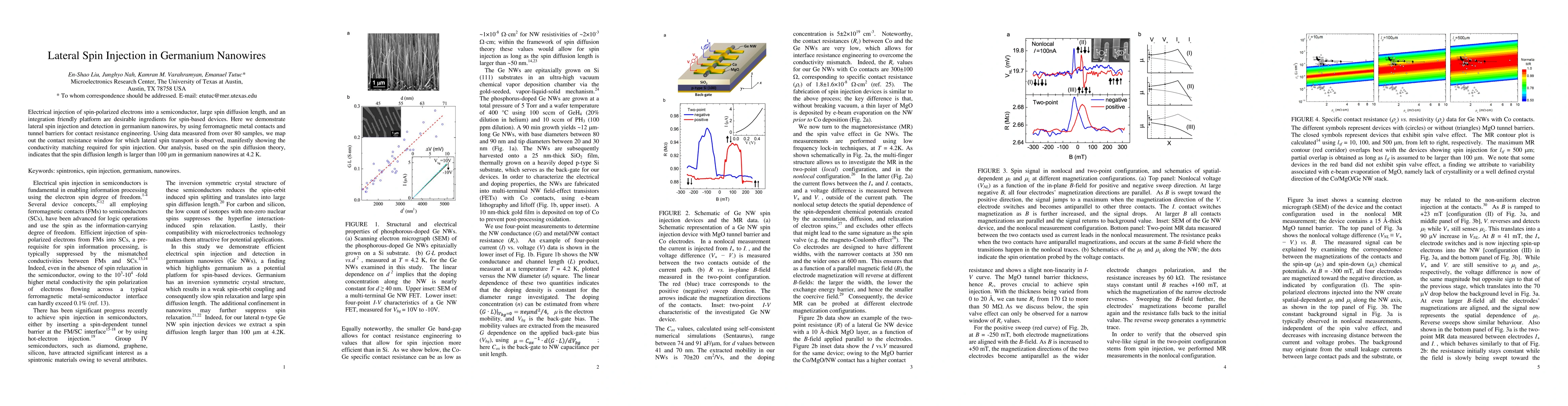 This research demonstrates lateral spin injection and detection in germanium nanowires using ferromagnetic metal contacts and tunnel barriers. It shows that spin diffusion length exceeds 100 μm in these nanowires at 4.2 K, highlighting the potential for spin-based devices.