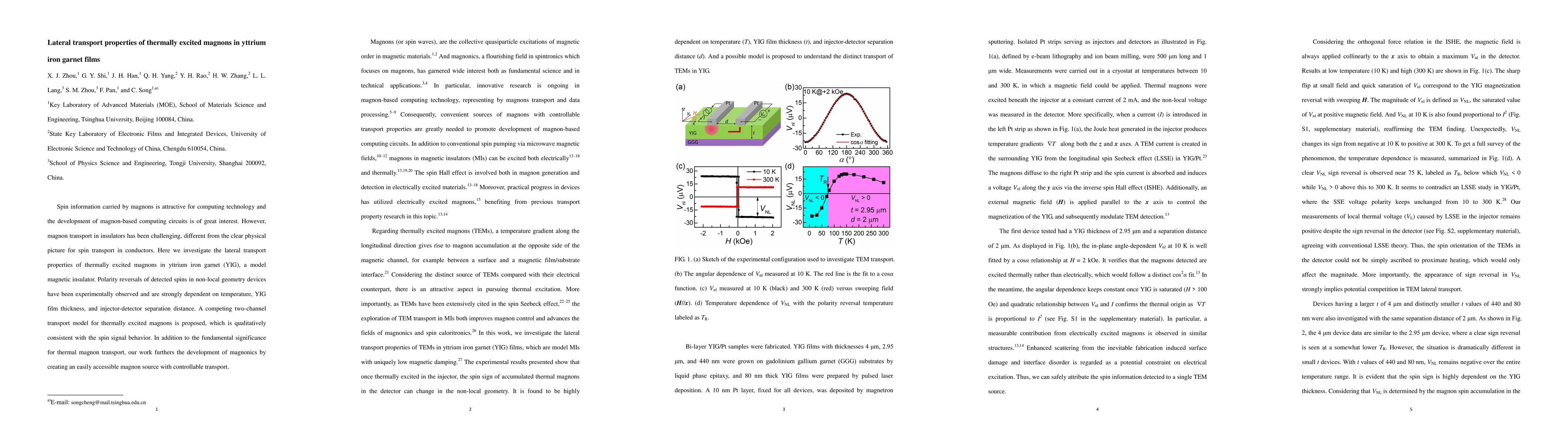 This paper investigates the lateral transport properties of thermally excited magnons in yttrium iron garnet (YIG) films, revealing temperature-dependent polarity reversals in spin signals. A two-channel transport model is proposed to explain the observed behavior, advancing the development of magnon-based computing circuits.