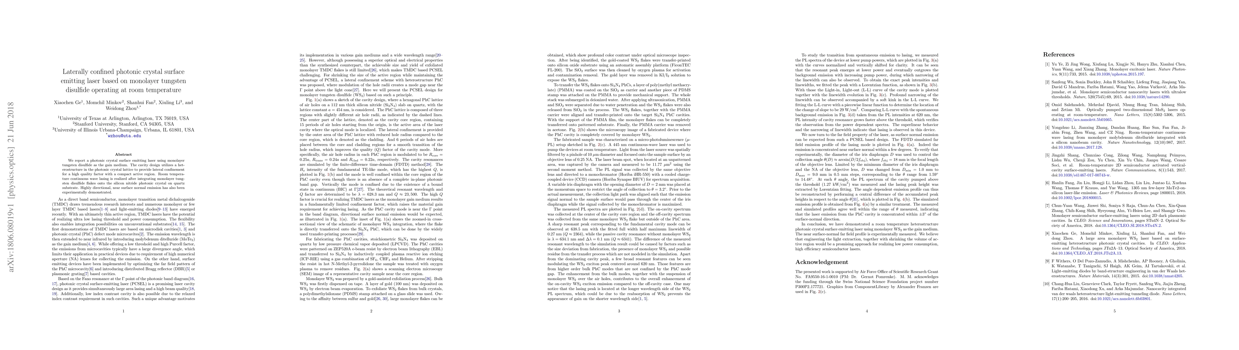 Summary: This research presents a photonic crystal surface emitting laser utilizing monolayer tungsten disulfide as the gain medium, achieving high-quality factor and compact active region confinement. Room temperature continuous wave lasing and highly directional near surface normal emission were realized.