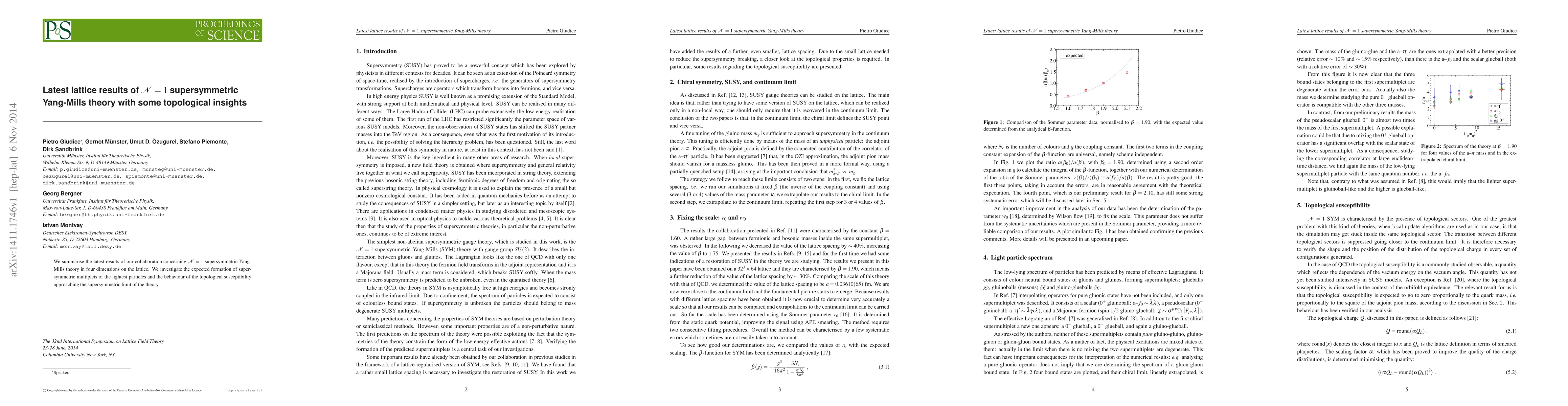 We summarise the latest results of our collaboration concerning N=1 supersymmetric Yang-Mills theory in four dimensions on the lattice. We investigate the expected formation of supersymmetric multiplets of the lightest particles and the behaviour of the topological susceptibility approaching the supersymmetric limit of the theory.