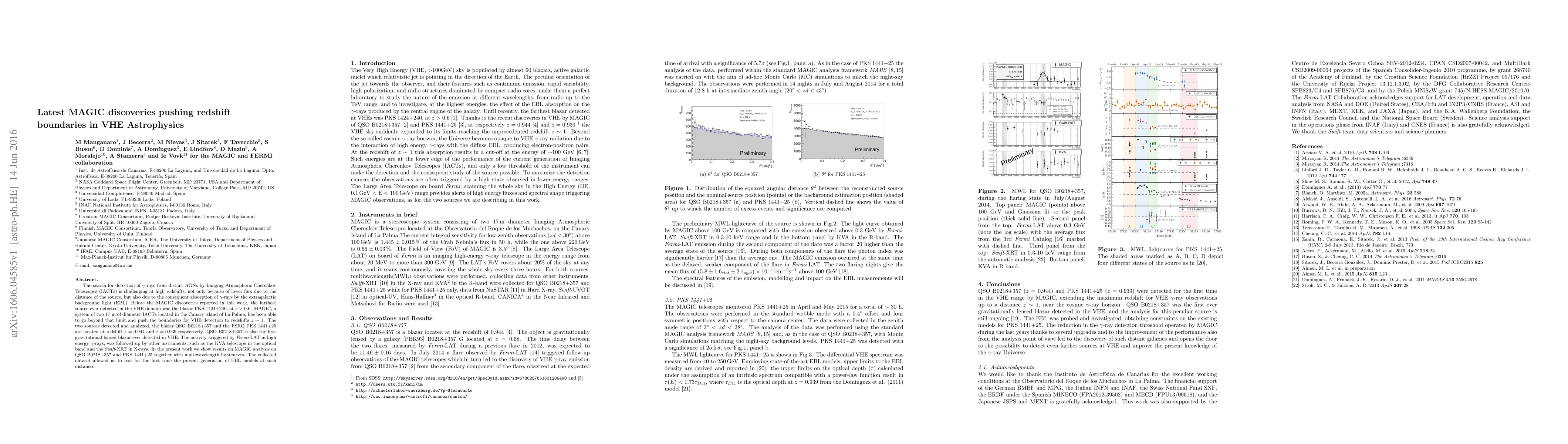 The search for detection of gamma-rays from distant AGNs by Imaging Atmospheric Cherenkov Telescopes (IACTs) is challenging at high redshifts, not only because of lower flux due to the distance of the source, but also due to the consequent absorption of gamma-rays by the extragalactic background light (EBL). Before the MAGIC discoveries reported in this work, the farthest source ever detected in the VHE domain was the blazar PKS 1424+240, at z>0.6. MAGIC, a system of two 17 m of diameter IACTs located in the Canary island of La Palma, has been able to go beyond that limit and push the boundaries for VHE detection to redshifts z~ 1. The two sources detected and analyzed, the blazar QSO B0218+357 and the FSRQ PKS 1441+25 are located at redshift z=0.944 and z=0.939 respectively. QSO B0218+357 is also the first gravitational lensed blazar ever detected in VHE. The activity, triggered by Fermi-LAT in high energy gamma-rays, was followed up by other instruments, such as the KVA telescope in the optical band and the Swift-XRT in X-rays. In the present work we show results on MAGIC analysis on QSO B0218+357 and PKS 1441+25 together with multiwavelength lightcurves. The collected dataset allowed us to test for the first time the present generation of EBL models at such distances.