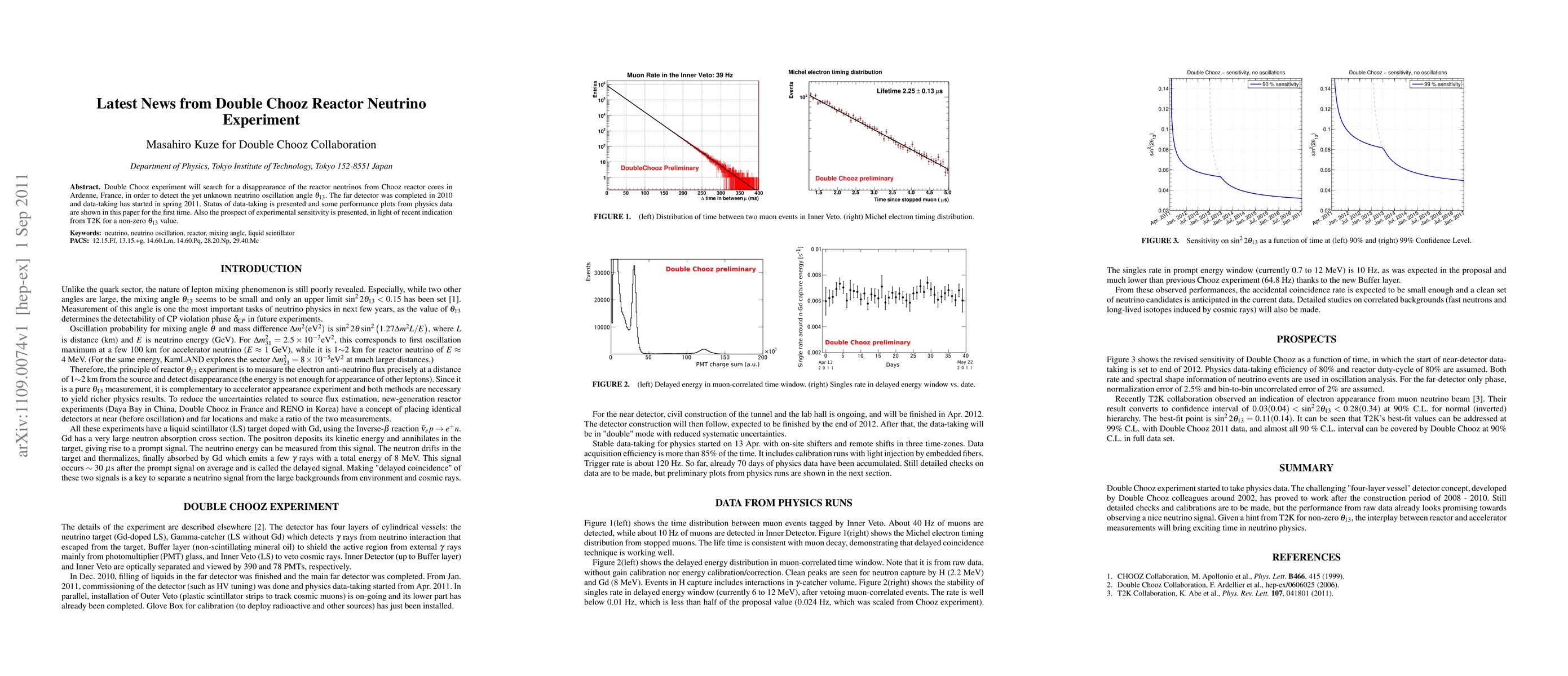 The Double Chooz experiment aims to detect the unknown neutrino oscillation angle θ13 by observing the disappearance of reactor neutrinos from French reactors. Initial data-taking began in 2011, with the far detector operational since 2010, and the paper presents early performance results and experimental sensitivity prospects.