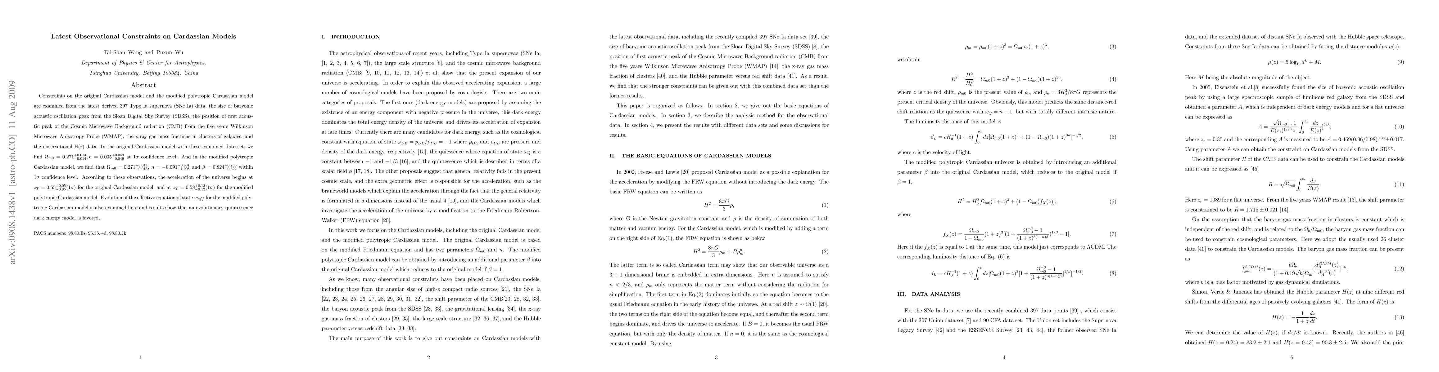 This paper examines observational constraints on two Cardassian models using recent data from Type Ia supernovae, baryonic acoustic oscillations, CMB, x-ray gas mass fractions, and H(z) data. The original Cardassian model yields $\Omega_{m0}=0.271^{+0.014}_{-0.014}$, $n=0.035^{+0.049}_{-0.049}$, while the modified polytropic model provides $\Omega_{m0}=0.271^{+0.014}_{-0.015}$, $n=-0.091^{+0.331}_{-1.908}$, $\beta=0.824^{+0.750}_{-0.622}$. Both models suggest the universe's acceleration begins around $z_T=0.55^{+0.05}_{-0.05}$ and $z_T=0.58^{+0.12}_{-0.12}$.