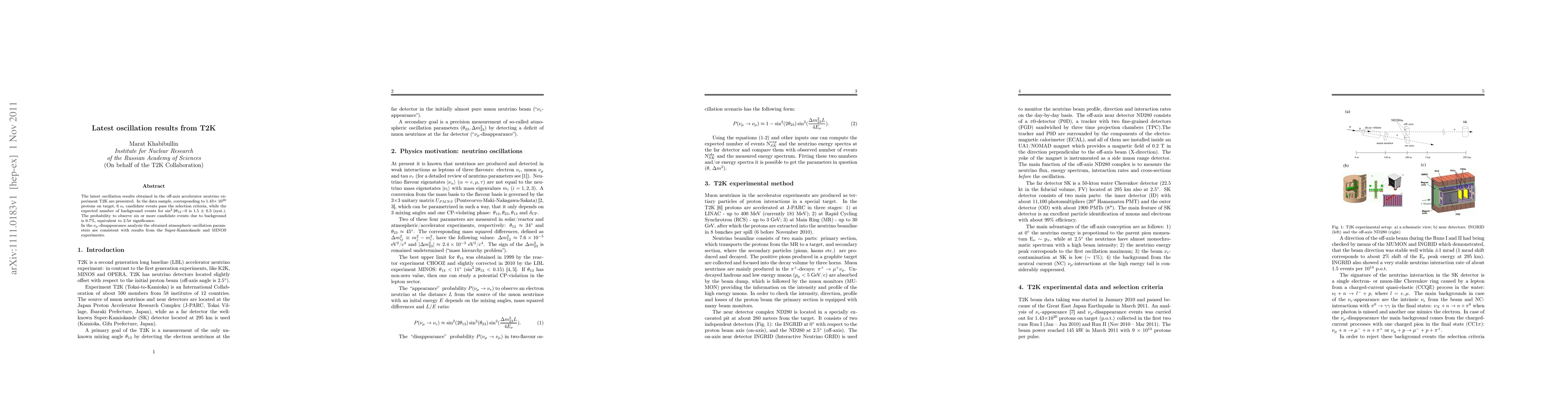 The T2K experiment reports new oscillation results showing 6 electron neutrino candidate events with a background expectation of 1.5±0.3, indicating a 2.5-sigma significance. The muon neutrino disappearance parameters align with Super-Kamiokande and MINOS findings.