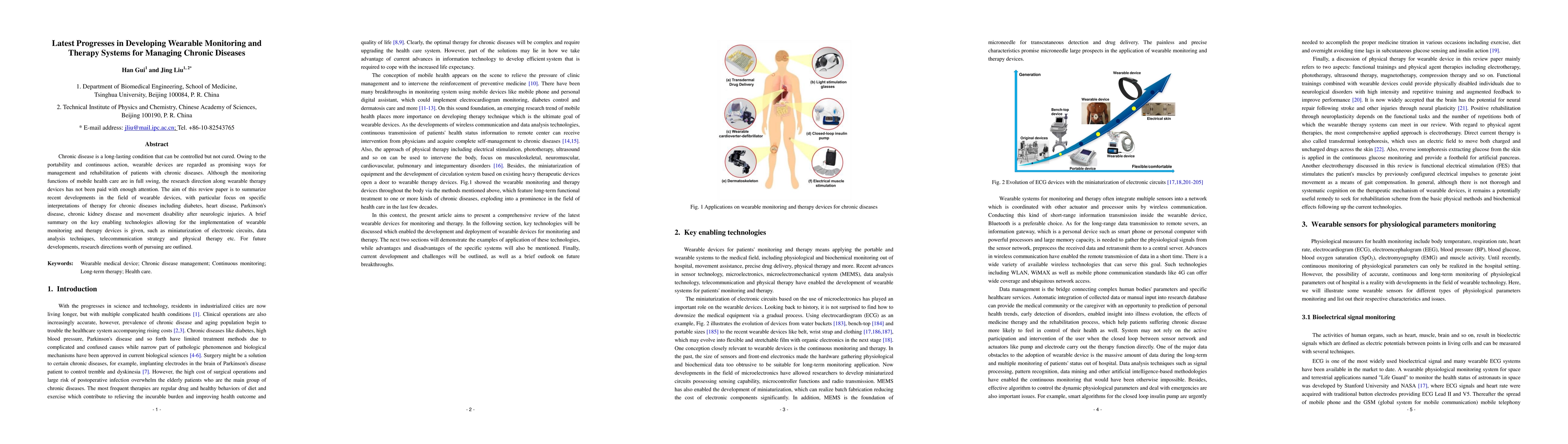 This review paper summarizes recent advancements in wearable monitoring and therapy systems for managing chronic diseases, highlighting developments in devices for diabetes, heart disease, Parkinson's disease, chronic kidney disease, and post-neurologic injury movement disabilities. It also discusses key enabling technologies like miniaturized electronics and data analysis.