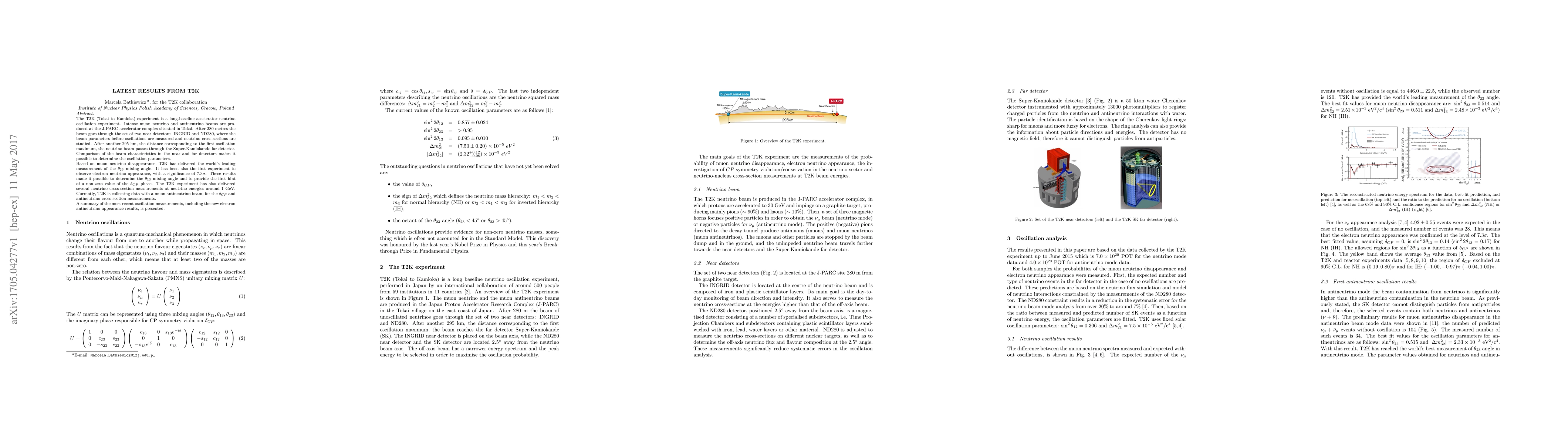 The T2K (Tokai to Kamioka) experiment is a long-baseline accelerator neutrino oscillation experiment. Intense muon neutrino and antineutrino beams are produced at the J-PARC accelerator complex situated in Tokai. After 280 metres the beam goes through the set of two near detectors: INGRID and ND280, where the beam parameters before oscillations are measured and neutrino cross-sections are studied. After another 295 km, the distance corresponding to the first oscillation maximum, the neutrino beam passes through the Super-Kamiokande far detector. Comparison of the beam characteristics in the near and far detectors makes it possible to determine the oscillation parameters. Based on muon neutrino disappearance, T2K has delivered the world's leading measurement of the $\theta_{23}$ mixing angle. It has been also the first experiment to observe electron neutrino appearance, with a significance of 7.3$\sigma$. These results made it possible to determine the $\theta_{13}$ mixing angle and to provide the first hint of a non-zero value of the $\delta_{CP}$ phase. The T2K experiment has also delivered several neutrino cross-section measurements at neutrino energies around 1 GeV. Currently, T2K is collecting data with a muon antineutrino beam, for the $\delta_{CP}$ and antineutrino cross-section measurements. A summary of the most recent oscillation measurements, including the new electron antineutrino appearance results, is presented.