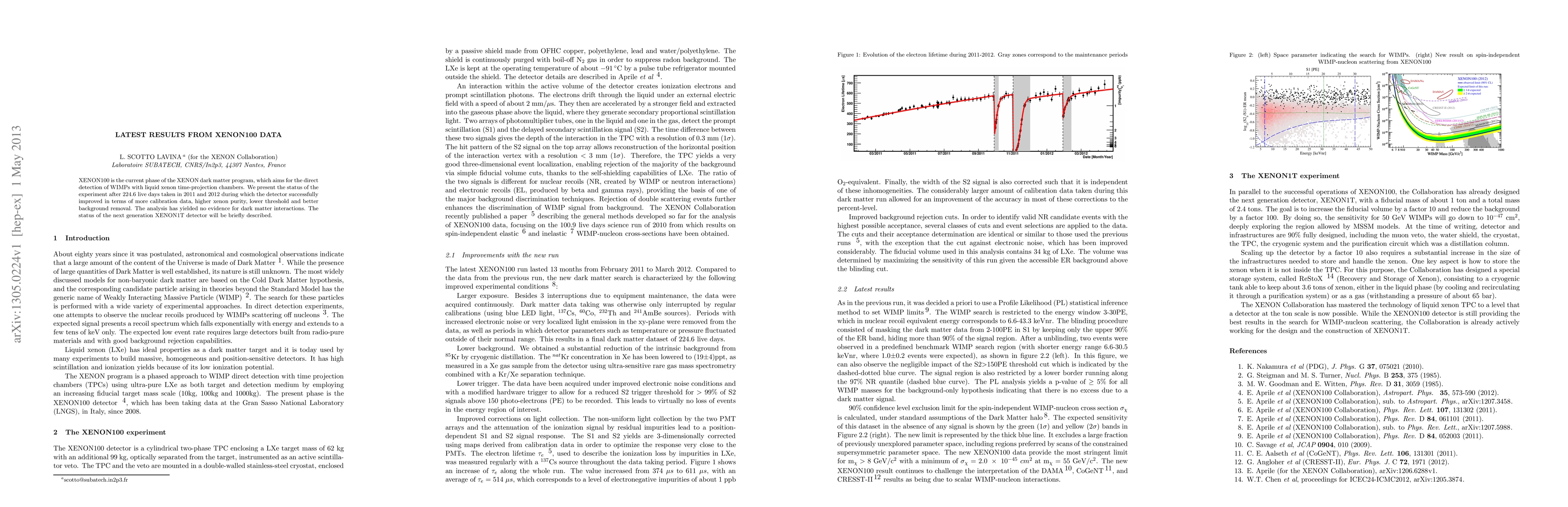 XENON100 is the current phase of the XENON dark matter program, which aims for the direct detection of WIMPs with liquid xenon time-projection chambers. We present the status of the experiment after 224.6 live days taken in 2011 and 2012 during which the detector successfully improved in terms of more calibration data, higher xenon purity, lower threshold and better background removal. The analysis has yielded no evidence for dark matter interactions. The status of the next generation XENON1T detector will be briefly described.