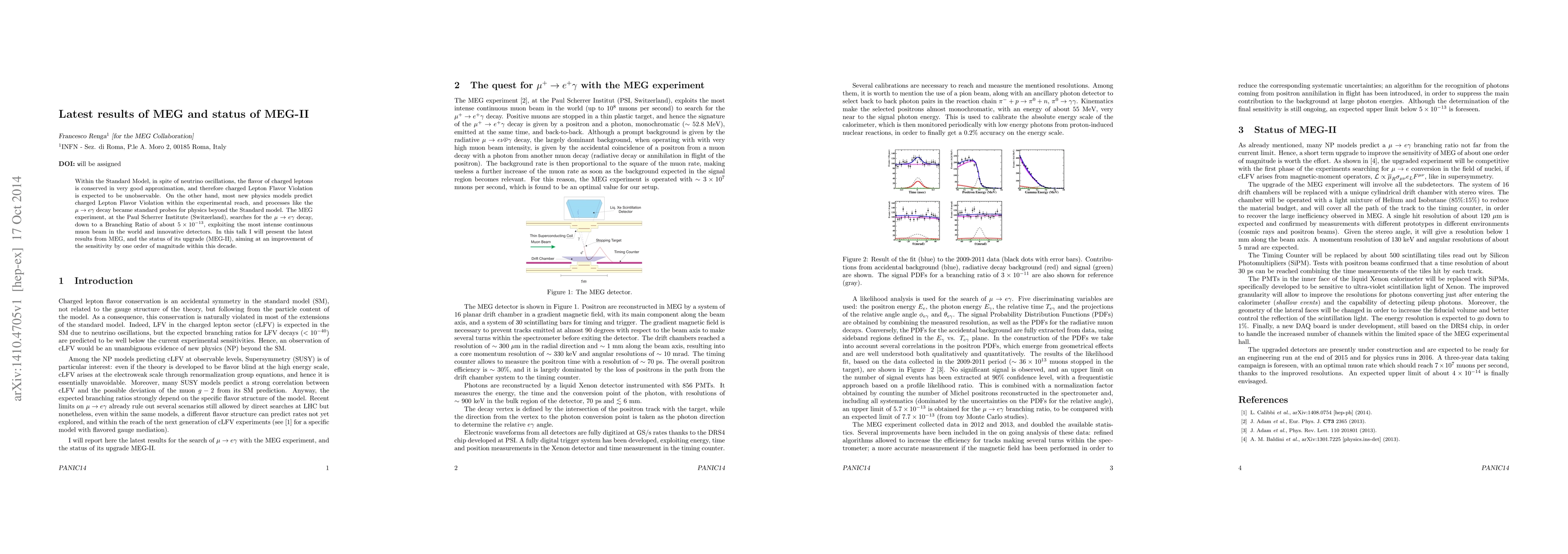 Within the Standard Model, in spite of neutrino oscillations, the flavor of charged leptons is conserved in very good approximation, and therefore charged Lepton Flavor Violation is expected to be unobservable. On the other hand, most new physics models predict charged Lepton Flavor Violation within the experimental reach, and processes like the $\mu \to e \gamma$ decay became standard probes for physics beyond the Standard model. The MEG experiment, at the Paul Scherrer Institute (Switzerland), searches for the $\mu \to e \gamma$ decay, down to a Branching Ratio of about $5 \times 10^{-13}$, exploiting the most intense continuous muon beam in the world and innovative detectors. In this talk I will present the latest results from MEG, and the status of its upgrade (MEG-II), aiming at an improvement of the sensitivity by one order of magnitude within this decade.