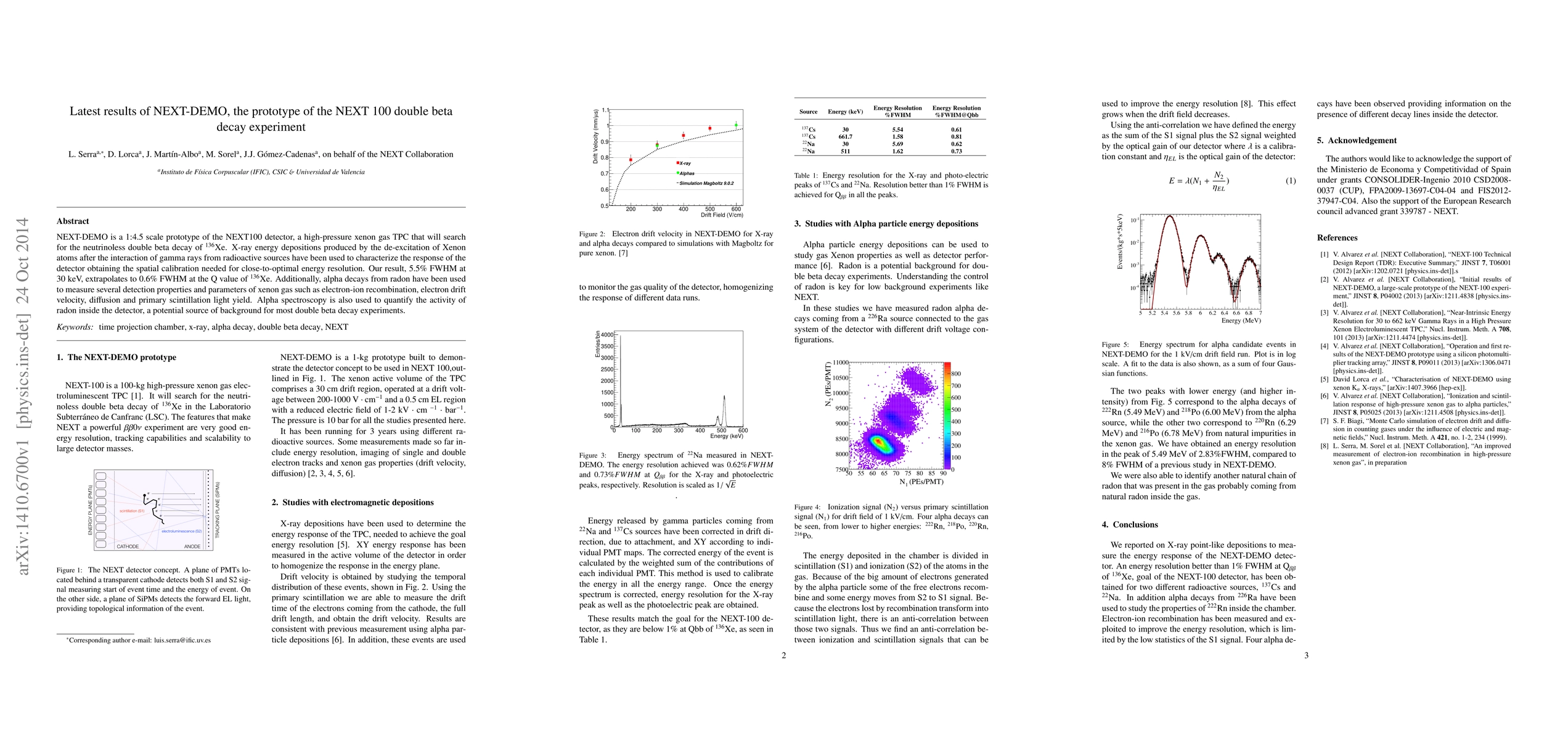 NEXT-DEMO is a 1:4.5 scale prototype of the NEXT100 detector, a high-pressure xenon gas TPC that will search for the neutrinoless double beta decay of $^{136}$Xe. X-ray energy depositions produced by the de-excitation of Xenon atoms after the interaction of gamma rays from radioactive sources have been used to characterize the response of the detector obtaining the spatial calibration needed for close-to-optimal energy resolution. Our result, 5.5% FWHM at 30 keV, extrapolates to 0.6% FWHM at the Q value of $^{136}$Xe. Additionally, alpha decays from radon have been used to measure several detection properties and parameters of xenon gas such as electron-ion recombination, electron drift velocity, diffusion and primary scintillation light yield. Alpha spectroscopy is also used to quantify the activity of radon inside the detector, a potential source of background for most double beta decay experiments.
