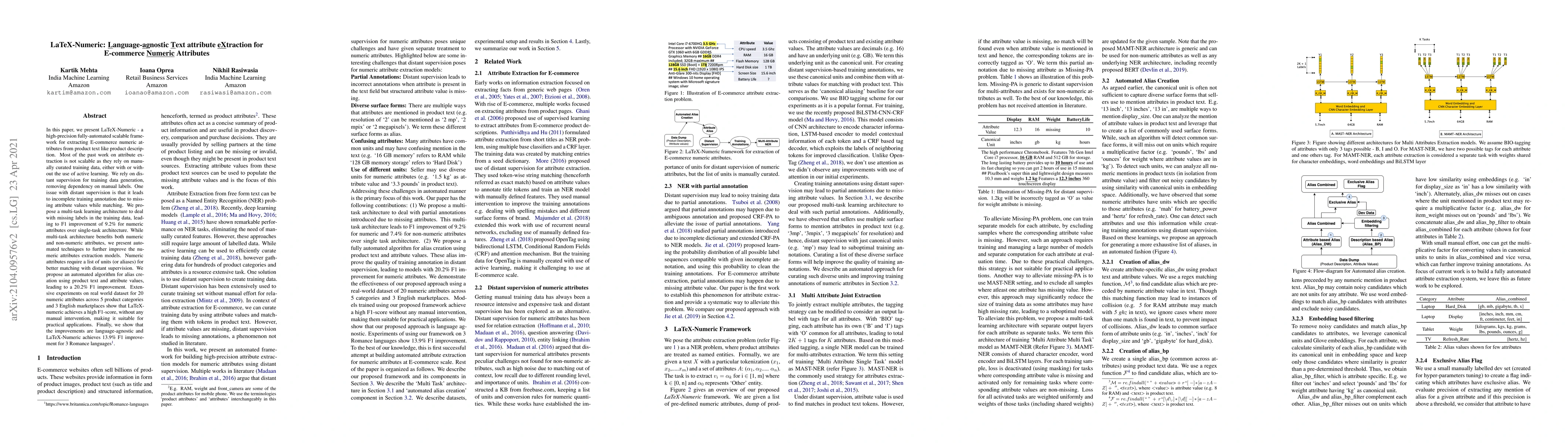 LaTeX-Numeric is a scalable framework for extracting numeric attributes from e-commerce product text using distant supervision and multi-task learning, achieving a 9.2% F1 improvement over single-task models and a 20.2% improvement through automated alias creation. The method is language-agnostic, demonstrating a 13.9% F1 improvement across Romance languages.
