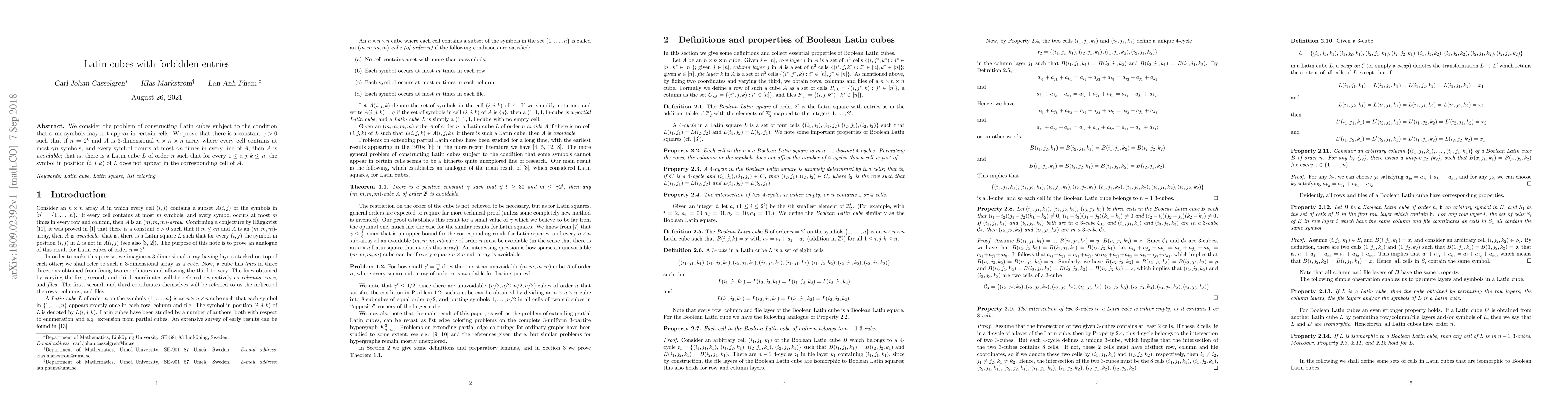 We consider the problem of constructing Latin cubes subject to the condition that some symbols may not appear in certain cells. We prove that there is a constant $\gamma > 0$ such that if $n=2^k$ and $A$ is $3$-dimensional $n\times n\times n$ array where every cell contains at most $\gamma n$ symbols, and every symbol occurs at most $\gamma n$ times in every line of $A$, then $A$ is {\em avoidable}; that is, there is a Latin cube $L$ of order $n$ such that for every $1\leq i,j,k\leq n$, the symbol in position $(i,j,k)$ of $L$ does not appear in the corresponding cell of $A$.