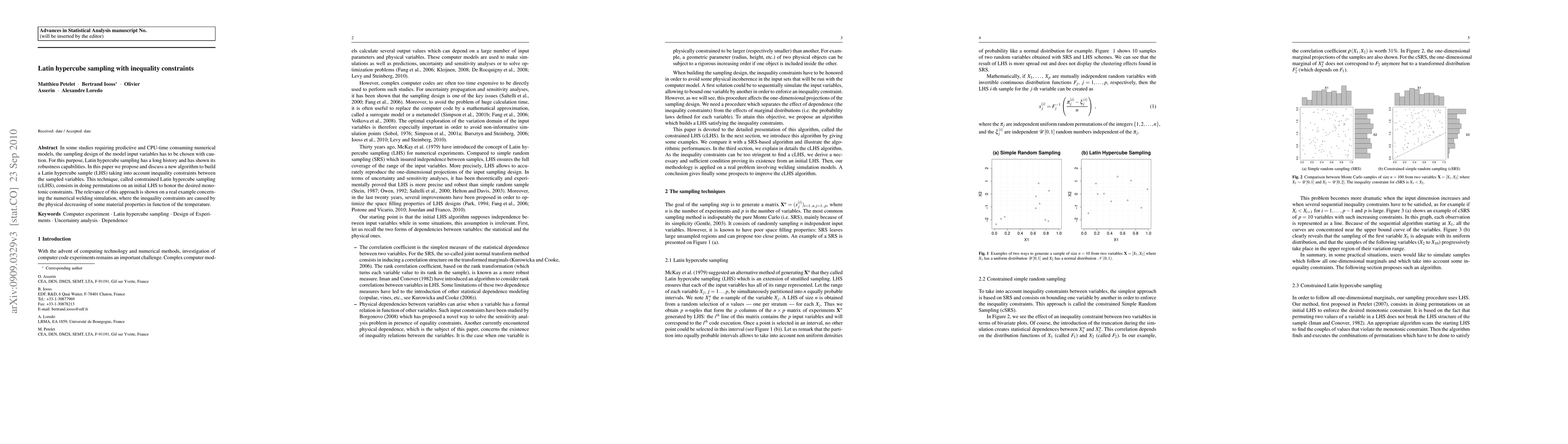 This paper proposes a new algorithm for constrained Latin hypercube sampling (cLHS) to incorporate inequality constraints in sampling designs for predictive models. The cLHS method involves permuting an initial LHS to respect monotonic constraints, demonstrated effectively in a numerical welding simulation example.