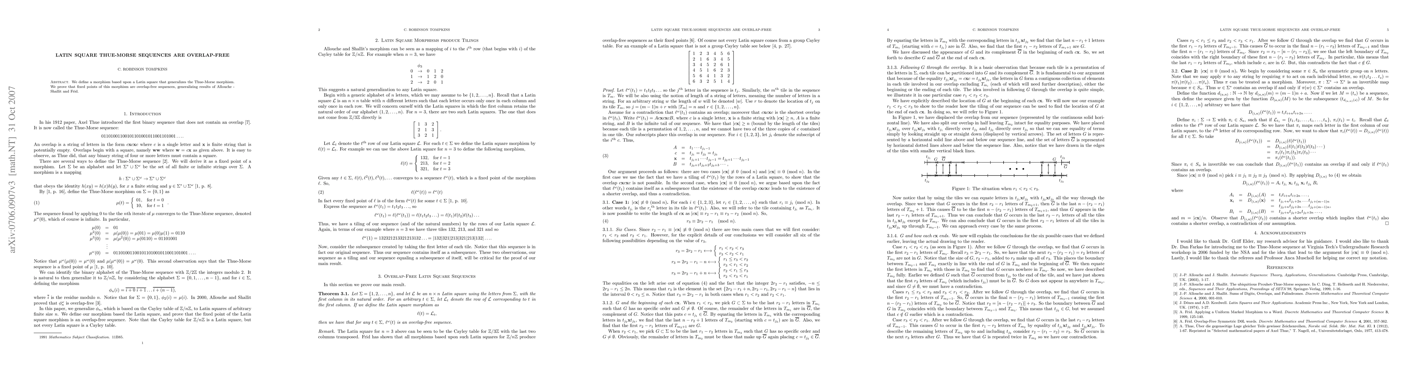 This paper introduces a Latin square-based morphism that generalizes the Thue-Morse sequence, proving that its fixed points generate overlap-free sequences, extending prior results by Allouche-Shallit and Frid.