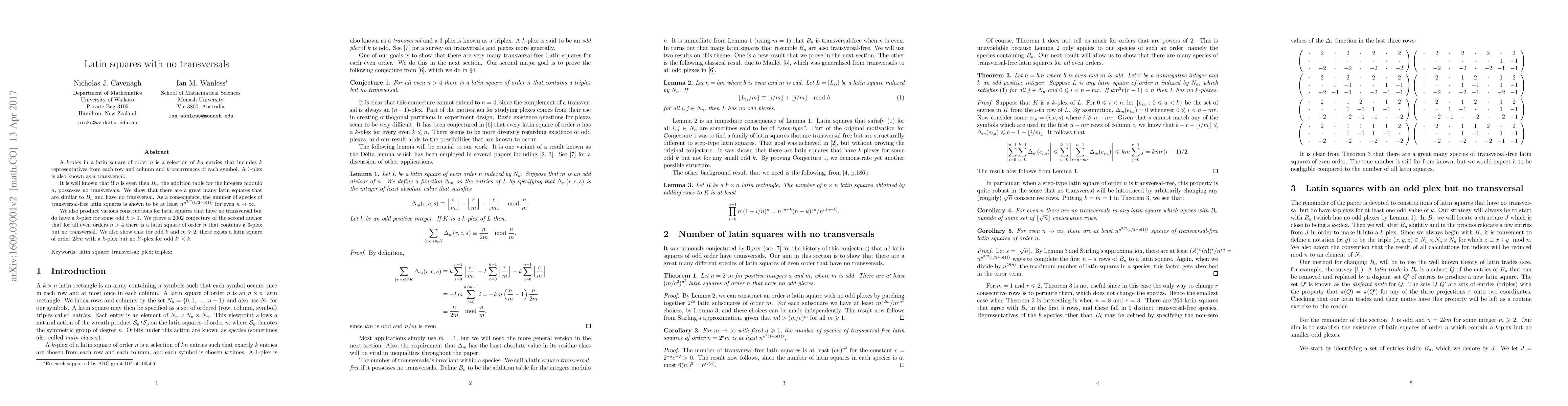 This paper explores latin squares with no transversals, demonstrating that many latin squares similar to the addition table for integers modulo an even number possess no transversals. It also constructs latin squares with specific $k$-plexes for odd $k>1$ and proves a conjecture regarding the existence of $3$-plexes without transversals in even-order latin squares.