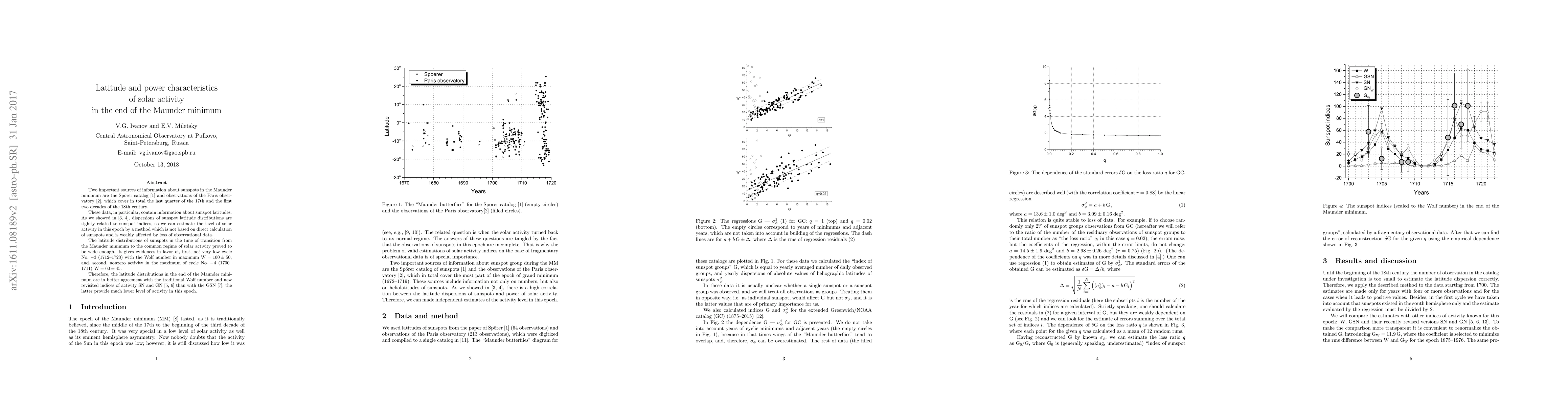 Two important sources of information about sunspots in the Maunder minimum are the Sp\"orer catalog and observations of the Paris observatory, which cover in total the last quarter of the 17th and the first two decades of the 18th century. These data, in particular, contain information about sunspot latitudes. As we showed in previous papers, dispersions of sunspot latitude distributions are tightly related to sunspot indices, so we can estimate the level of solar activity in this epoch by a method which is not based on direct calculation of sunspots and is weakly affected by loss of observational data. The latitude distributions of sunspots in the time of transition from the Maunder minimum to the common regime of solar activity proved to be wide enough. It gives evidences in favor of, first, not very low cycle No. -3 (1712-1723) with the Wolf number in maximum W=$100\pm50$, and, second, nonzero activity in the maximum of cycle No. -4 (1700-1711) W=$60\pm45$. Therefore, the latitude distributions in the end of the Maunder minimum are in better agreement with the traditional Wolf number and new revisited indices of activity SN and GN than with the GSN; the latter provide much lower level of activity in this epoch.