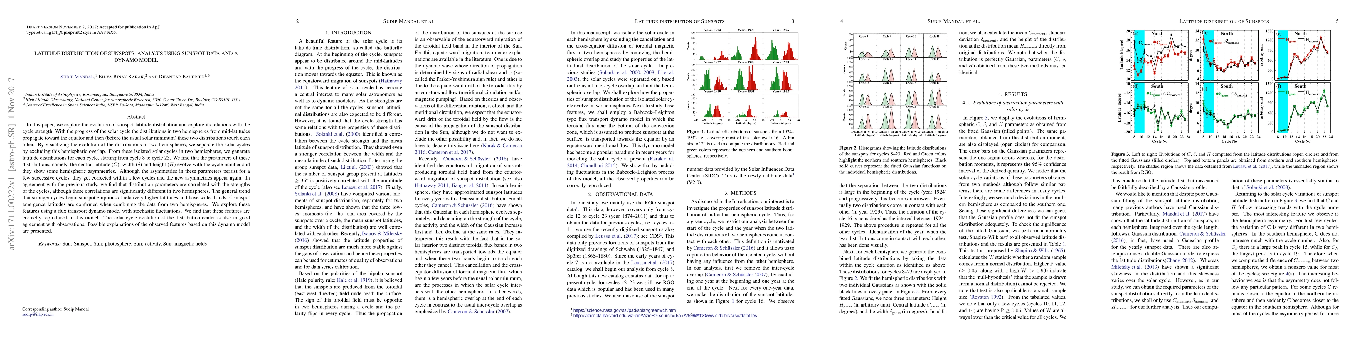 This paper analyzes the evolution of sunspot latitude distribution over solar cycles 8 to 23, revealing hemispheric asymmetries and correlations with cycle strength. The study confirms that stronger cycles initiate sunspots at higher latitudes and wider latitudinal bands, findings reproduced by a flux transport dynamo model.