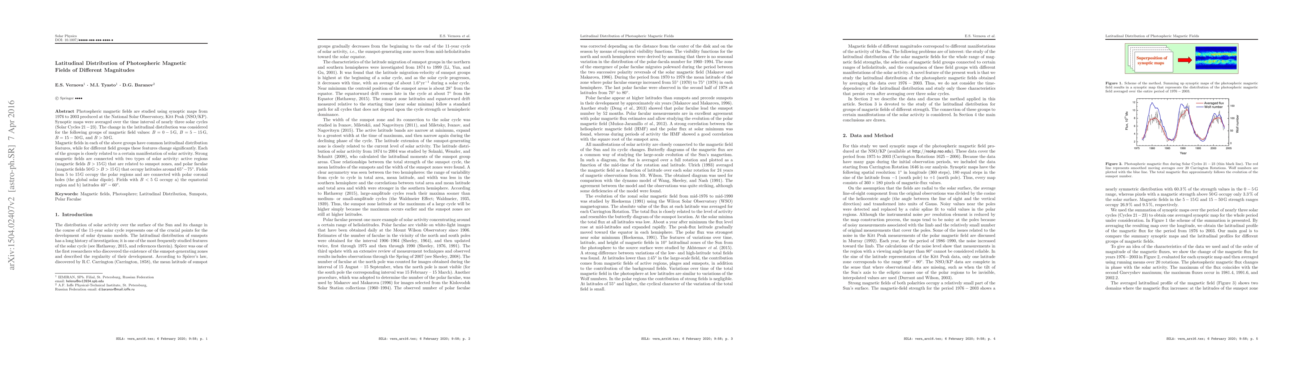 This study analyzes the latitudinal distribution of photospheric magnetic fields over nearly three solar cycles (1976-2003), revealing distinct patterns for different magnetic field strengths: B<5 G fields are found in the equatorial and mid-latitudes, while B>5 G fields are associated with active regions and polar faculae.