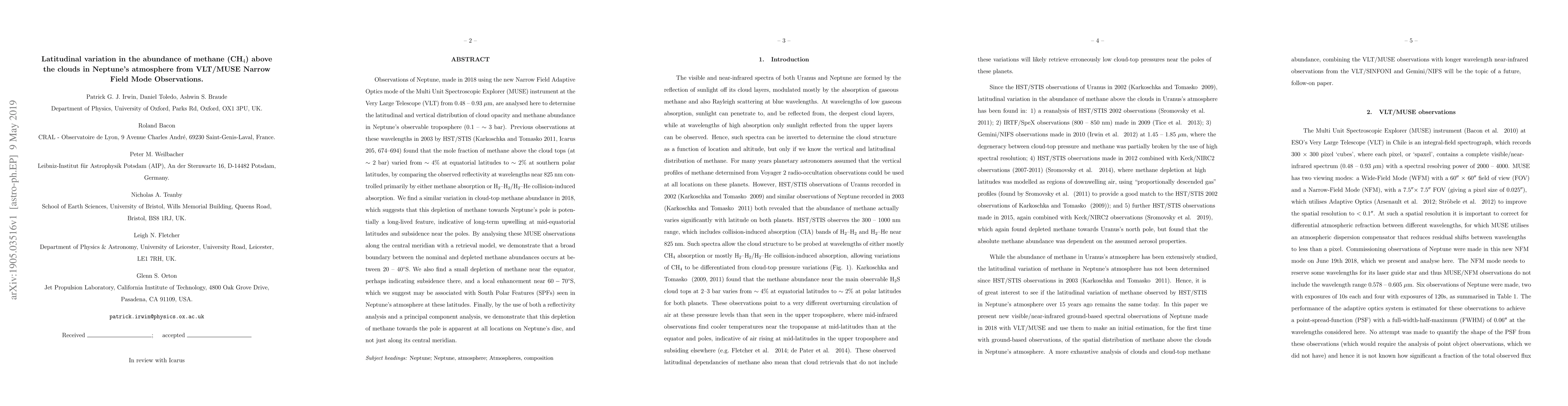 This study analyzes 2018 VLT/MUSE observations of Neptune to determine the latitudinal variation in methane abundance above the clouds, revealing a similar depletion trend towards the poles compared to 2003 HST/STIS data, suggesting a long-term atmospheric feature. The findings indicate a broad boundary of methane depletion between 20-40S, with potential subsidence near the equator and enhancements near 60-70S, possibly linked to South Polar Features.