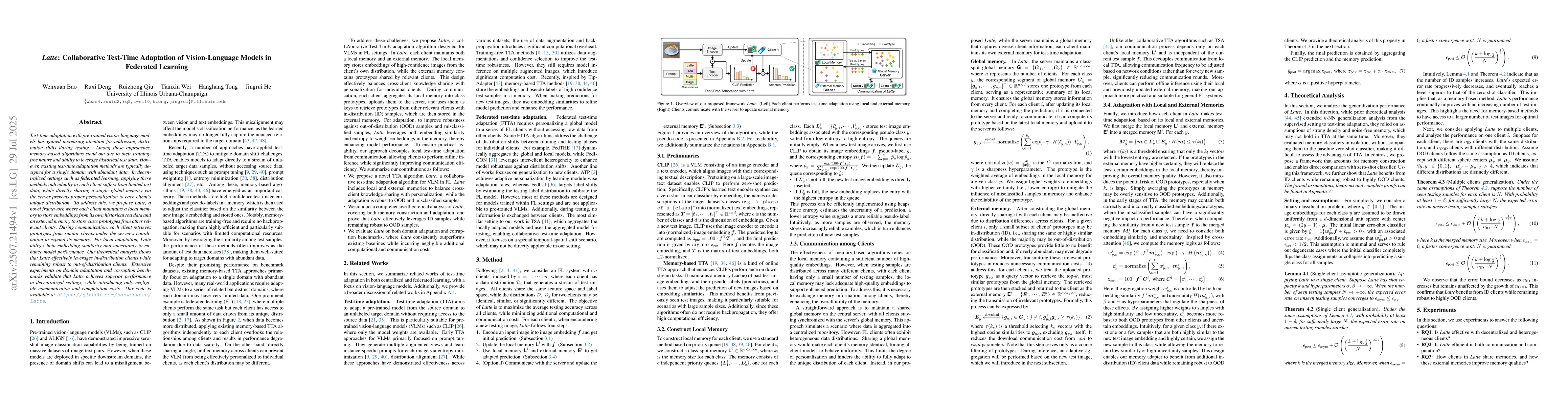 Test-time adaptation with pre-trained vision-language models has gained increasing attention for addressing distribution shifts during testing. Among these approaches, memory-based algorithms stand out due to their training-free nature and ability to leverage historical test data. However, existing test-time adaptation methods are typically designed for a single domain with abundant data. In decentralized settings such as federated learning, applying these methods individually to each client suffers from limited test data, while directly sharing a single global memory via the server prevents proper personalization to each client's unique distribution. To address this, we propose Latte, a novel framework where each client maintains a local memory to store embeddings from its own historical test data and an external memory to store class prototypes from other relevant clients. During communication, each client retrieves prototypes from similar clients under the server's coordination to expand its memory. For local adaptation, Latte utilizes both embedding similarity and uncertainty to enhance model performance. Our theoretical analysis shows that Latte effectively leverages in-distribution clients while remaining robust to out-of-distribution clients. Extensive experiments on domain adaptation and corruption benchmarks validate that Latte achieves superior performance in decentralized settings, while introducing only negligible communication and computation costs. Our code is available at https://github.com/baowenxuan/Latte .