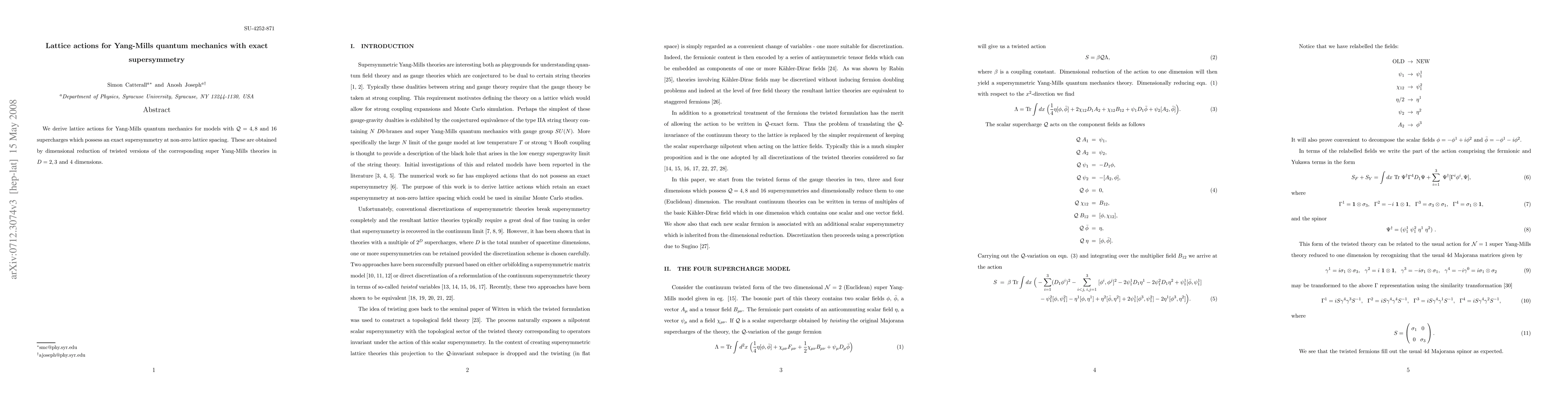 This research develops lattice actions for Yang-Mills quantum mechanics featuring exact supersymmetry for models with 4, 8, and 16 supercharges, obtained through dimensional reduction of twisted super Yang-Mills theories in lower dimensions. These actions maintain supersymmetry at non-zero lattice spacings.