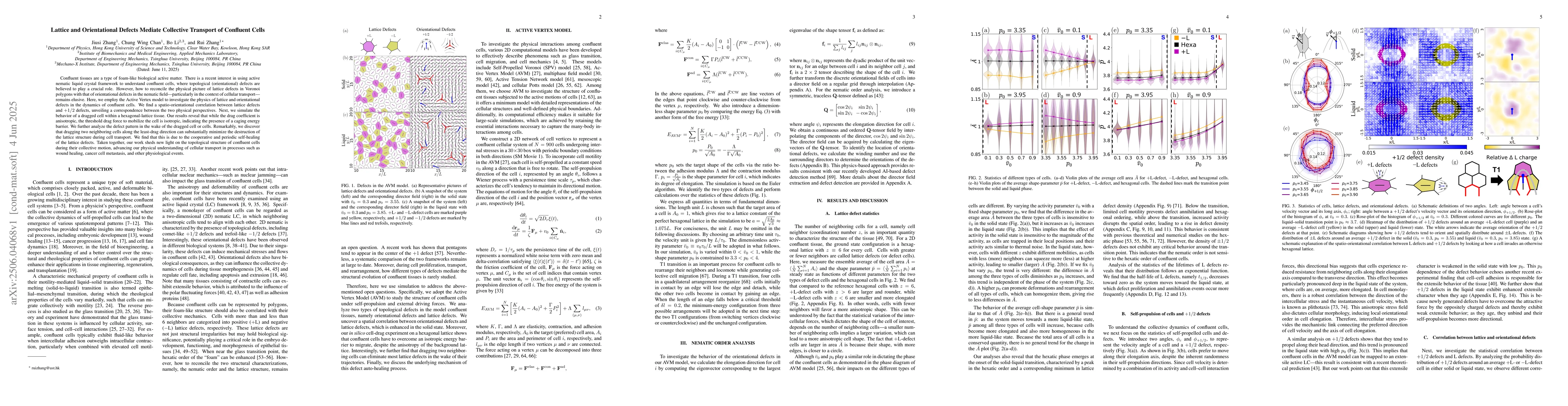 The identification of a correlation between lattice and orientational defects, and the elucidation of anisotropic drag and caging energy barrier in cell transport.