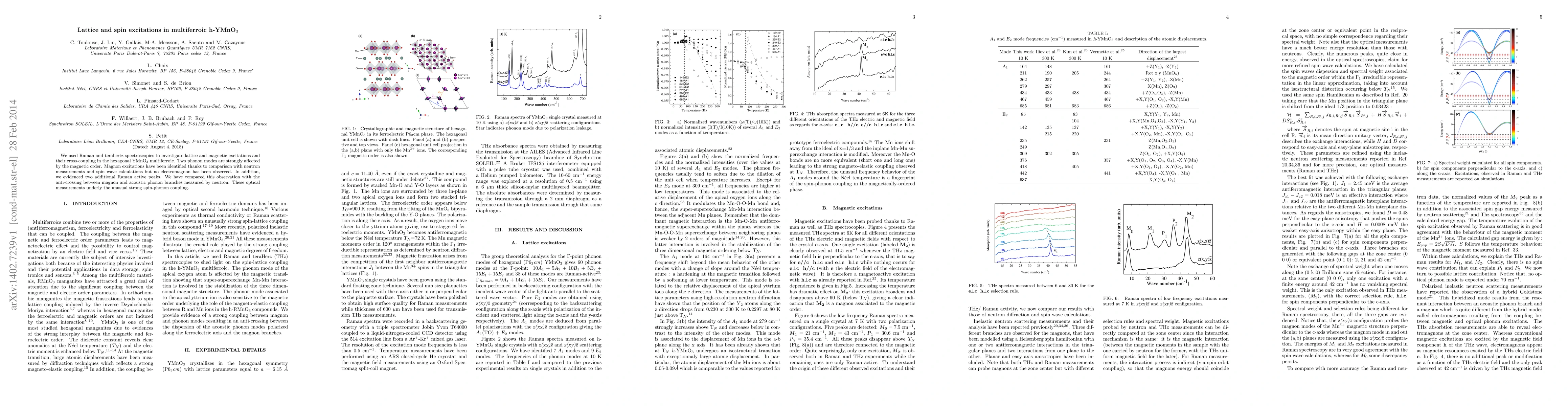 We used Raman and terahertz spectroscopies to investigate lattice and magnetic excitations and their cross-coupling in the hexagonal YMnO3 multiferroic. Two phonon modes are strongly affected by the magnetic order. Magnon excitations have been identified thanks to comparison with neutron measurements and spin wave calculations but no electromagnon has been observed. In addition, we evidenced two additional Raman active peaks. We have compared this observation with the anti-crossing between magnon and acoustic phonon branches measured by neutron. These optical measurements underly the unusual strong spin-phonon coupling.