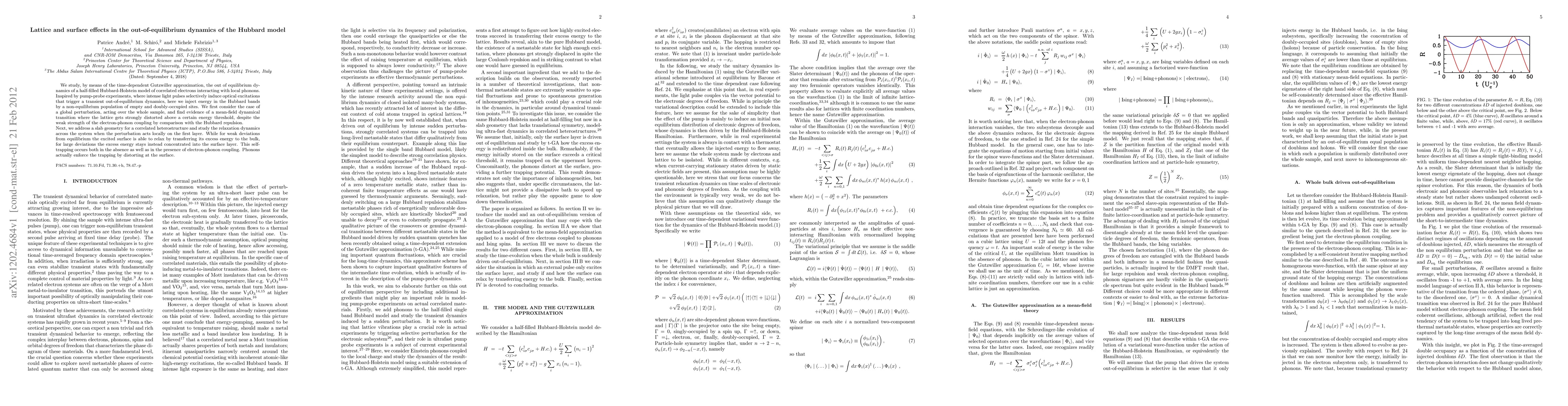 This paper investigates the out-of-equilibrium dynamics of the Hubbard-Holstein model using the time-dependent Gutzwiller approximation, revealing a mean-field dynamical transition and lattice distortion above a certain energy threshold. It also explores relaxation dynamics in a slab geometry, finding that large deviations from equilibrium cause energy to self-trap in the surface layer, especially in the presence of electron-phonon coupling.