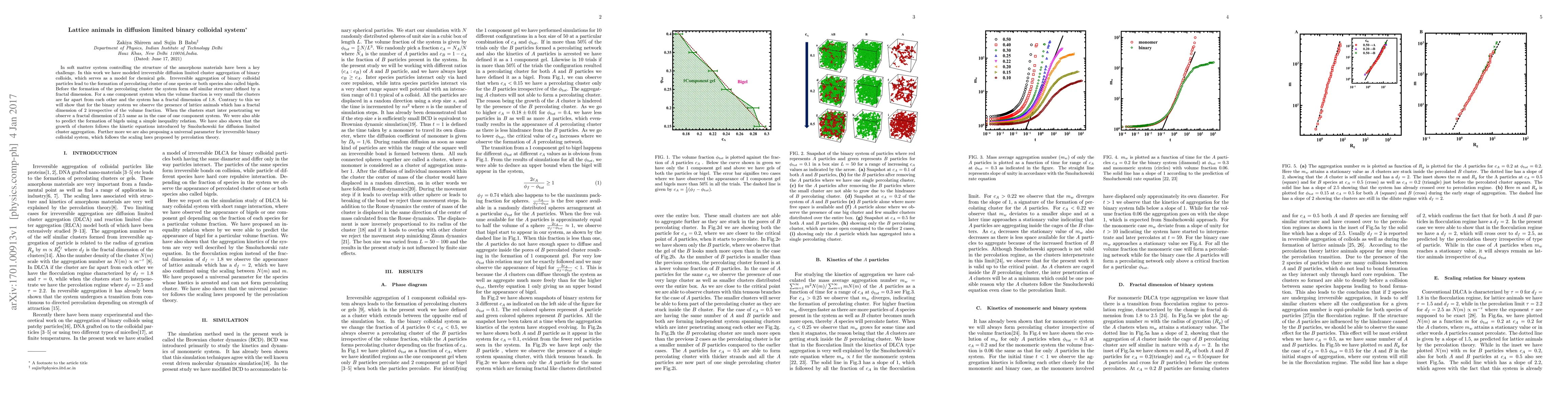 This paper models irreversible diffusion-limited cluster aggregation in binary colloidal systems, revealing the formation of lattice animals with a fractal dimension of 2, contrasting with the 1.8 dimension in single-component systems. It also predicts the formation of bigels and confirms cluster growth follows Smoluchowski's kinetic equations.