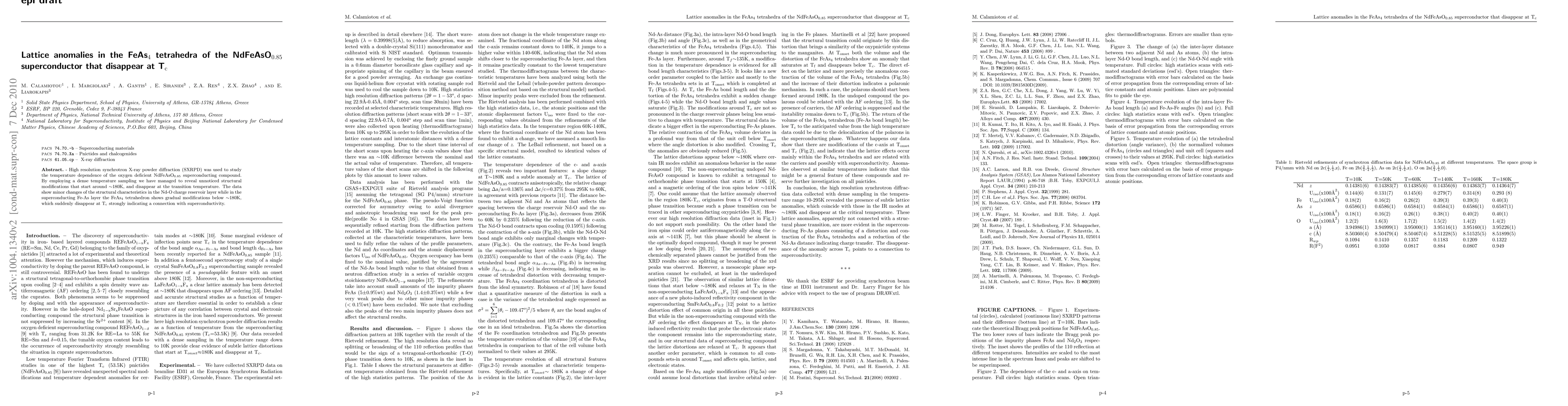 This research uses high-resolution synchrotron X-ray powder diffraction to analyze the temperature-dependent structure of the oxygen-deficient NdFeAsO0.85 superconductor. It discovers subtle structural changes in the FeAs4 tetrahedra below ~180K, which vanish at the superconducting transition temperature (Tc), suggesting a link between these lattice anomalies and superconductivity.