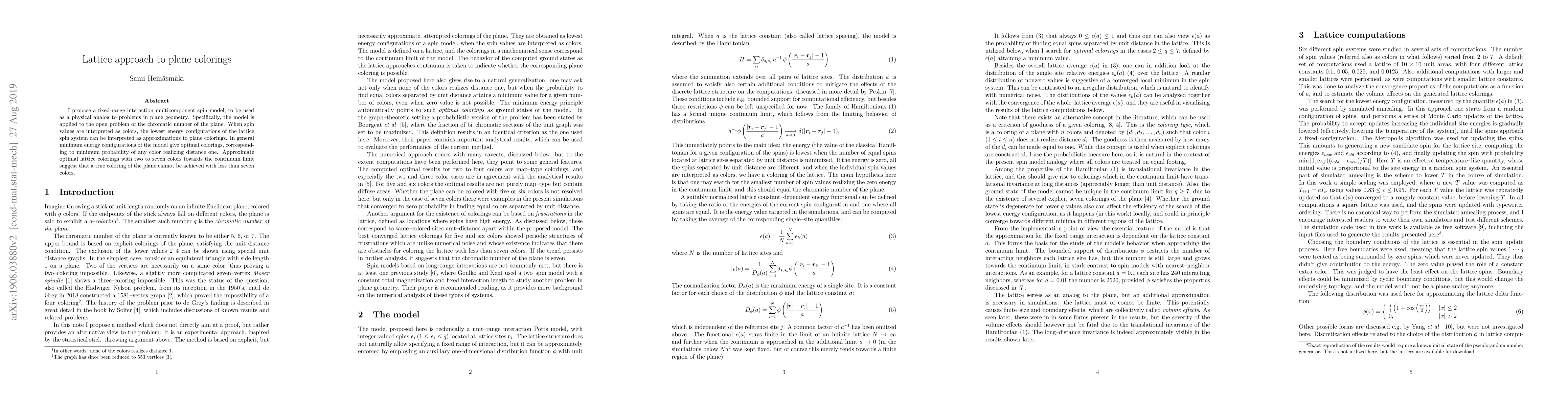 I propose a fixed-range interaction multicomponent spin model, to be used as a physical analog to problems in plane geometry. Specifically, the model is applied to the open problem of the chromatic number of the plane. When spin values are interpreted as colors, the lowest energy configurations of the lattice spin system can be interpreted as approximations to plane colorings. In general minimum energy configurations of the model give optimal colorings, corresponding to minimum probability of any color realizing distance one. Approximate optimal lattice colorings with two to seven colors towards the continuum limit suggest that a true coloring of the plane cannot be achieved with less than seven colors.