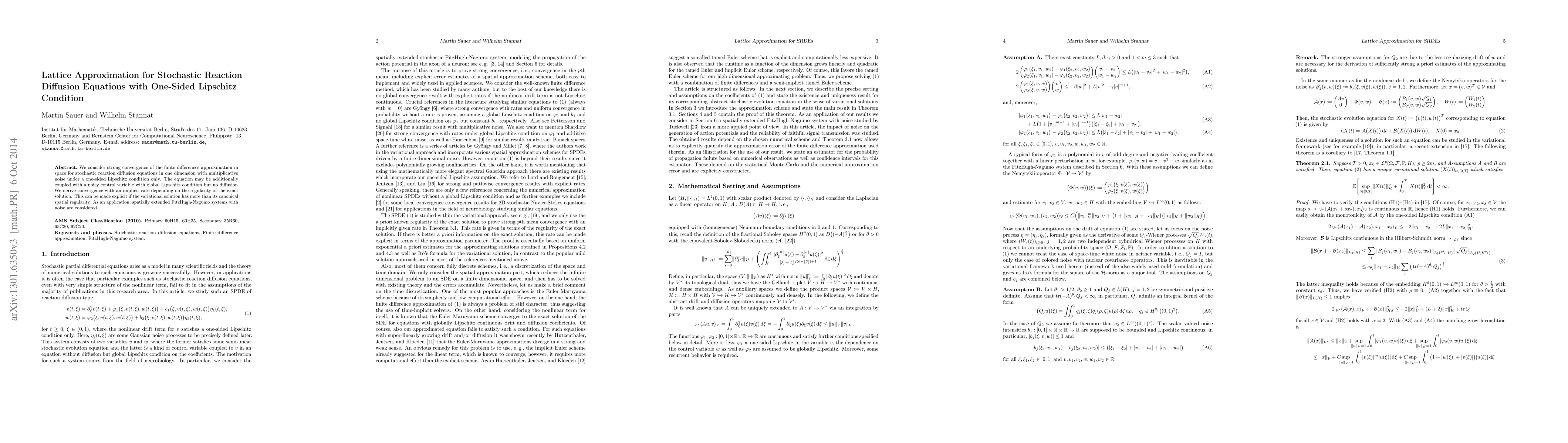 We consider strong convergence of the finite differences approximation in space for stochastic reaction diffusion equations with multiplicative noise under a one-sided Lipschitz condition only. We derive convergence with an implicit rate depending on the regularity of the exact solution. This can be made explicit if the variational solution has more than its canonical spatial regularity. As an application, spatially extended FitzHugh-Nagumo systems with noise are considered.