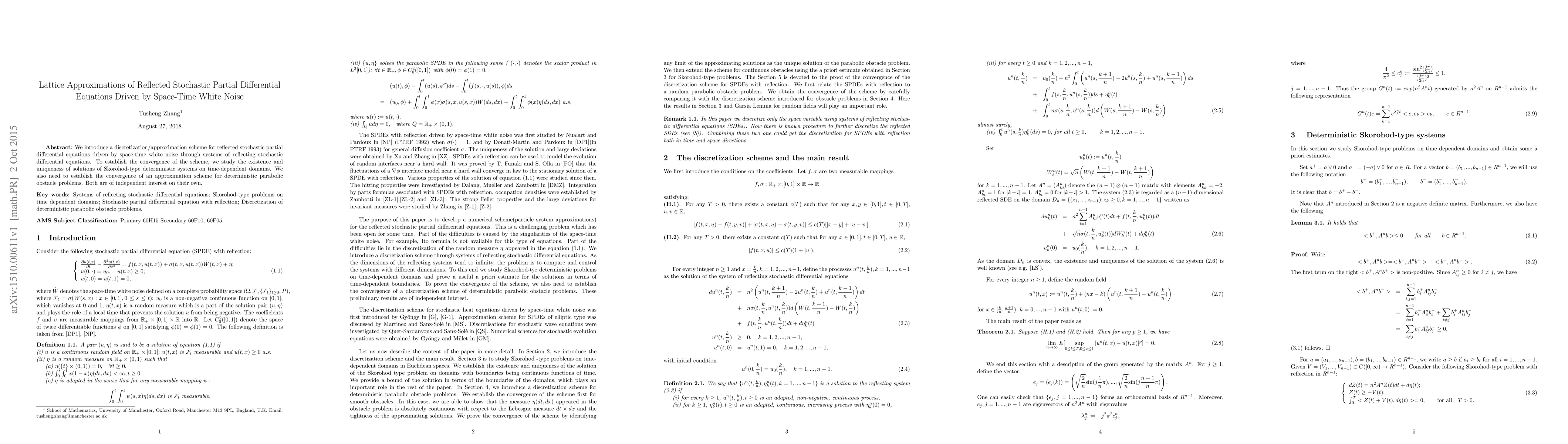 This paper proposes a lattice approximation scheme for reflected stochastic partial differential equations driven by space-time white noise, utilizing reflecting stochastic differential equations. The study establishes the convergence of the scheme by proving the existence and uniqueness of solutions for Skorohod-type deterministic systems on time-dependent domains, and the convergence of an approximation scheme for deterministic parabolic obstacle problems.
