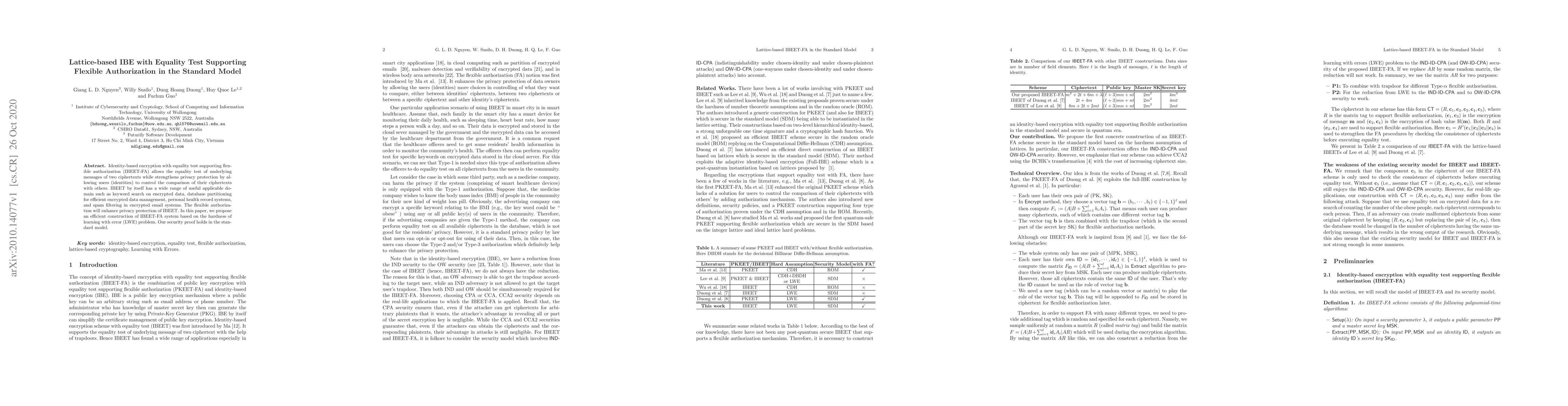 This paper proposes an efficient lattice-based identity-based encryption with equality test and flexible authorization (IBEET-FA) system, leveraging the hardness of the learning with error problem. The system enhances privacy protection by allowing users to control comparisons between their ciphertexts, with security proofs valid in the standard model.