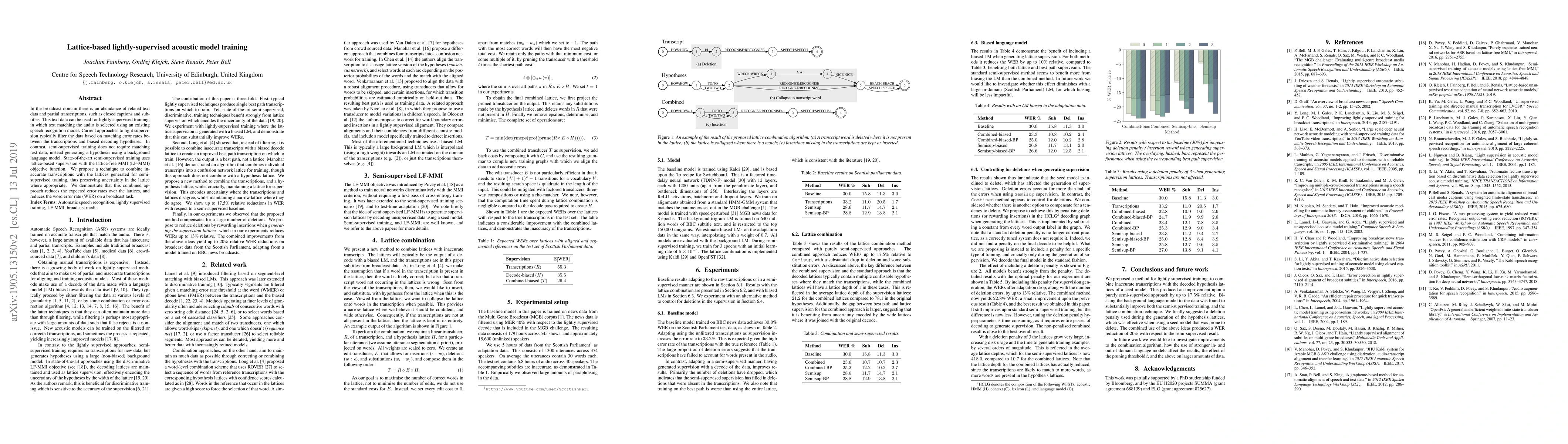 In the broadcast domain there is an abundance of related text data and partial transcriptions, such as closed captions and subtitles. This text data can be used for lightly supervised training, in which text matching the audio is selected using an existing speech recognition model. Current approaches to light supervision typically filter the data based on matching error rates between the transcriptions and biased decoding hypotheses. In contrast, semi-supervised training does not require matching text data, instead generating a hypothesis using a background language model. State-of-the-art semi-supervised training uses lattice-based supervision with the lattice-free MMI (LF-MMI) objective function. We propose a technique to combine inaccurate transcriptions with the lattices generated for semi-supervised training, thus preserving uncertainty in the lattice where appropriate. We demonstrate that this combined approach reduces the expected error rates over the lattices, and reduces the word error rate (WER) on a broadcast task.
