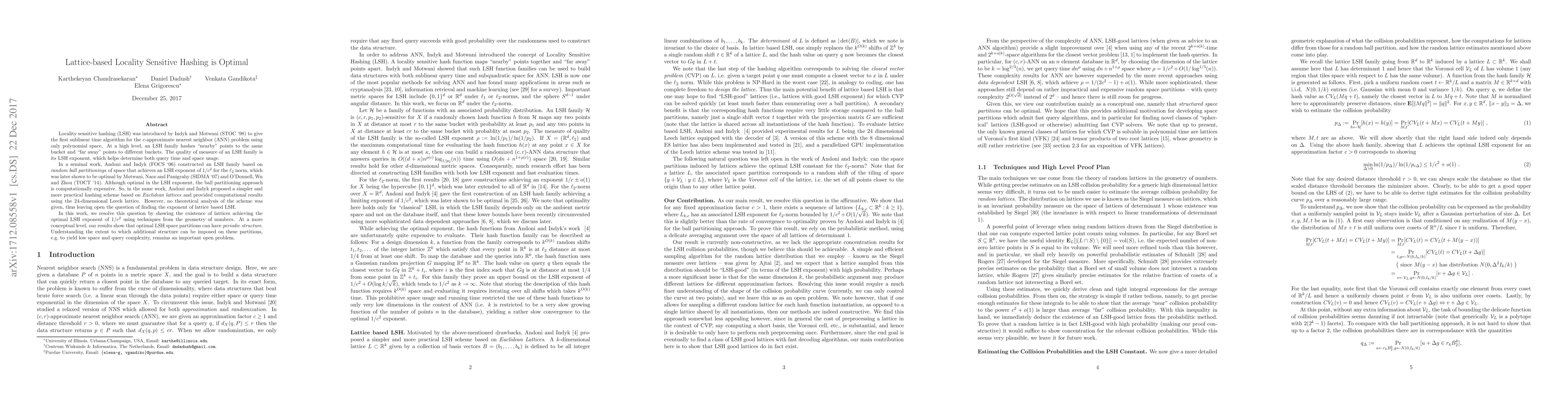 This paper demonstrates that lattice-based Locality Sensitive Hashing (LSH) achieves the optimal LSH exponent of 1/c^2 for the l_2 norm, resolving previous theoretical gaps. It uses techniques from the geometry of numbers to show the potential of lattices in achieving optimal LSH.