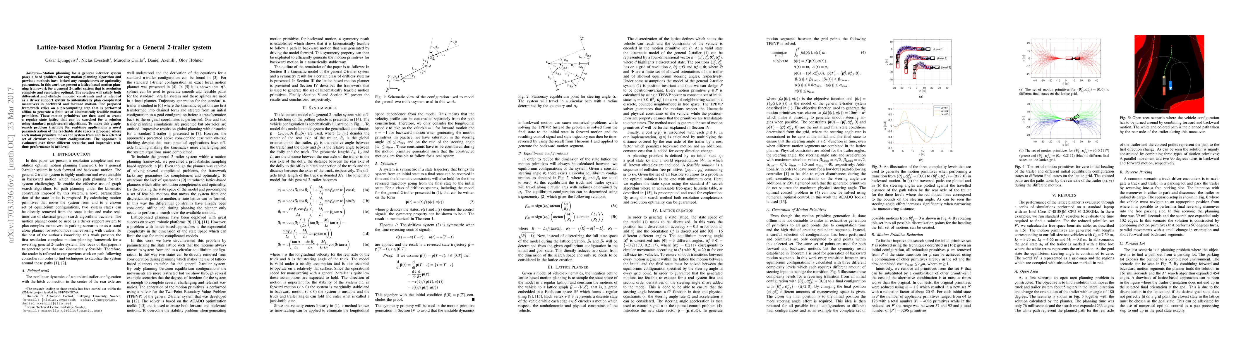 This paper introduces a lattice-based motion planning framework for a general 2-trailer system, ensuring completeness and optimality while satisfying differential and obstacle constraints. The offline computation of kinematically feasible motion primitives enables real-time graph-search for complex maneuvers, demonstrated through successful performance in three scenarios.