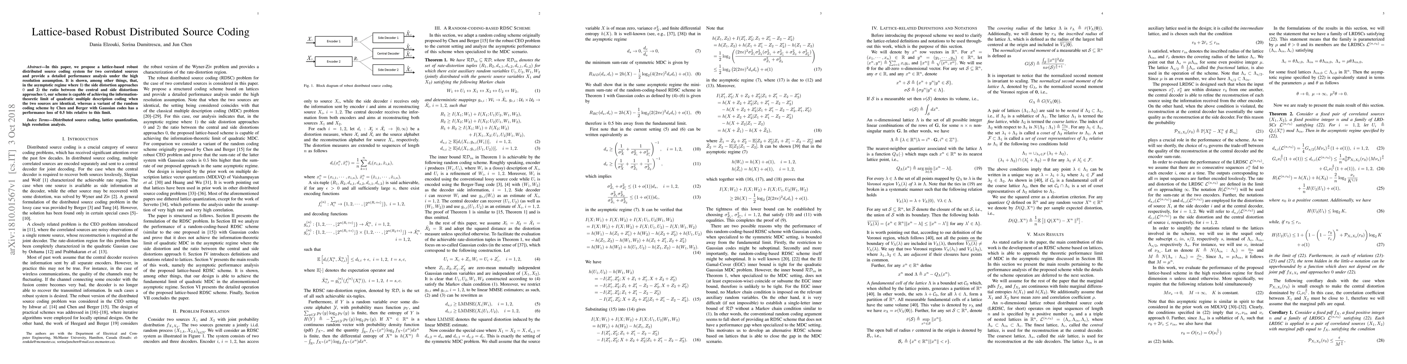 Researchers developed a lattice-based distributed source coding system that achieves the information-theoretic limit for quadratic multiple description coding under specific assumptions. This approach outperforms a related random coding scheme in achieving optimal performance.
