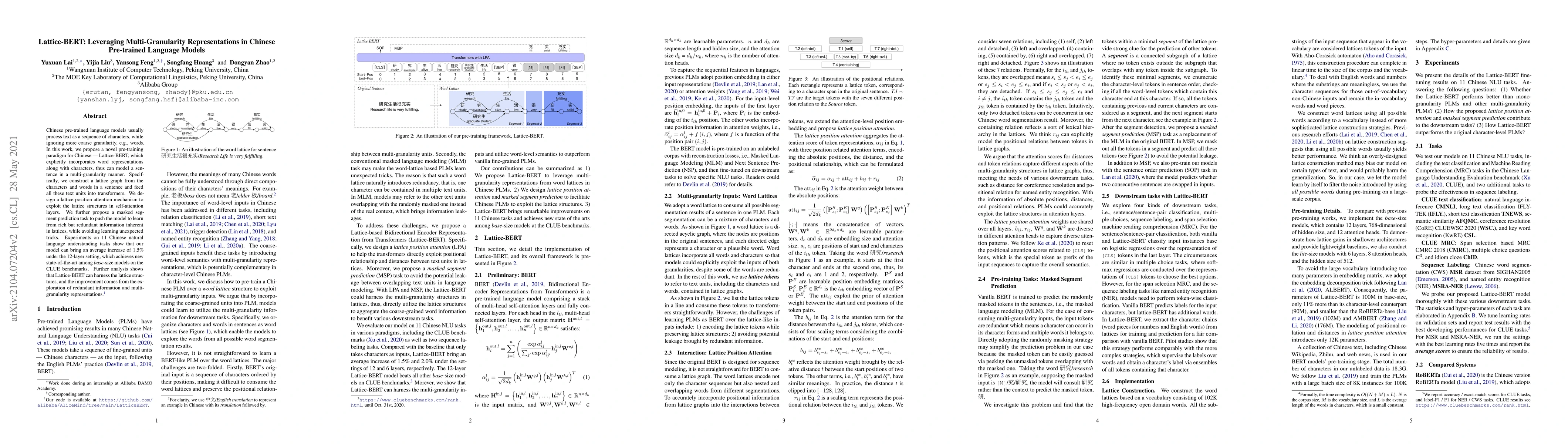 Lattice-BERT introduces a novel pre-training paradigm for Chinese language models by incorporating both character and word representations, achieving multi-granularity sentence modeling. The model demonstrates improved performance on 11 Chinese natural language understanding tasks, achieving new state-of-the-art results on the CLUE benchmarks.