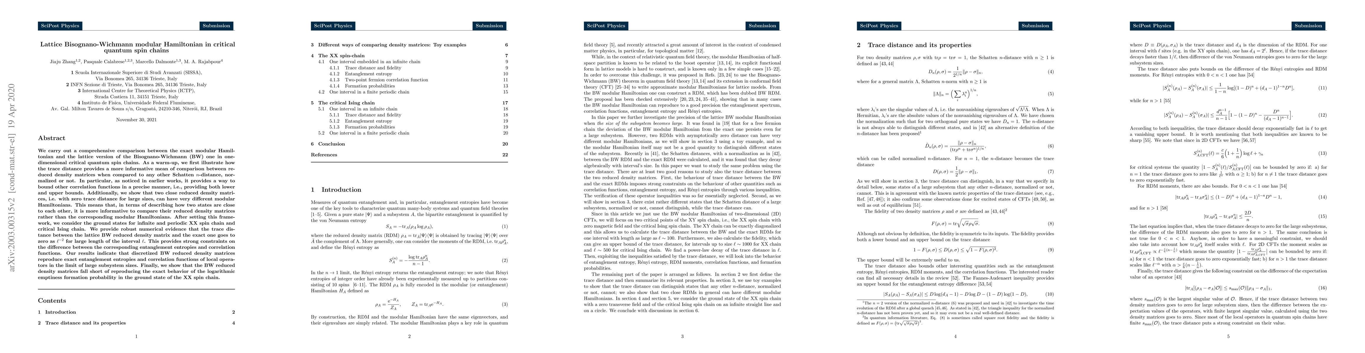 We carry out a comprehensive comparison between the exact modular Hamiltonian and the lattice version of the Bisognano-Wichmann (BW) one in one-dimensional critical quantum spin chains. As a warm-up, we first illustrate how the trace distance provides a more informative mean of comparison between reduced density matrices when compared to any other Schatten $n$-distance, normalized or not. In particular, as noticed in earlier works, it provides a way to bound other correlation functions in a precise manner, i.e., providing both lower and upper bounds. Additionally, we show that two close reduced density matrices, i.e. with zero trace distance for large sizes, can have very different modular Hamiltonians. This means that, in terms of describing how two states are close to each other, it is more informative to compare their reduced density matrices rather than the corresponding modular Hamiltonians. After setting this framework, we consider the ground states for infinite and periodic XX spin chain and critical Ising chain. We provide robust numerical evidence that the trace distance between the lattice BW reduced density matrix and the exact one goes to zero as $\ell^{-2}$ for large length of the interval $\ell$. This provides strong constraints on the difference between the corresponding entanglement entropies and correlation functions. Our results indicate that discretized BW reduced density matrices reproduce exact entanglement entropies and correlation functions of local operators in the limit of large subsystem sizes. Finally, we show that the BW reduced density matrices fall short of reproducing the exact behavior of the logarithmic emptiness formation probability in the ground state of the XX spin chain.