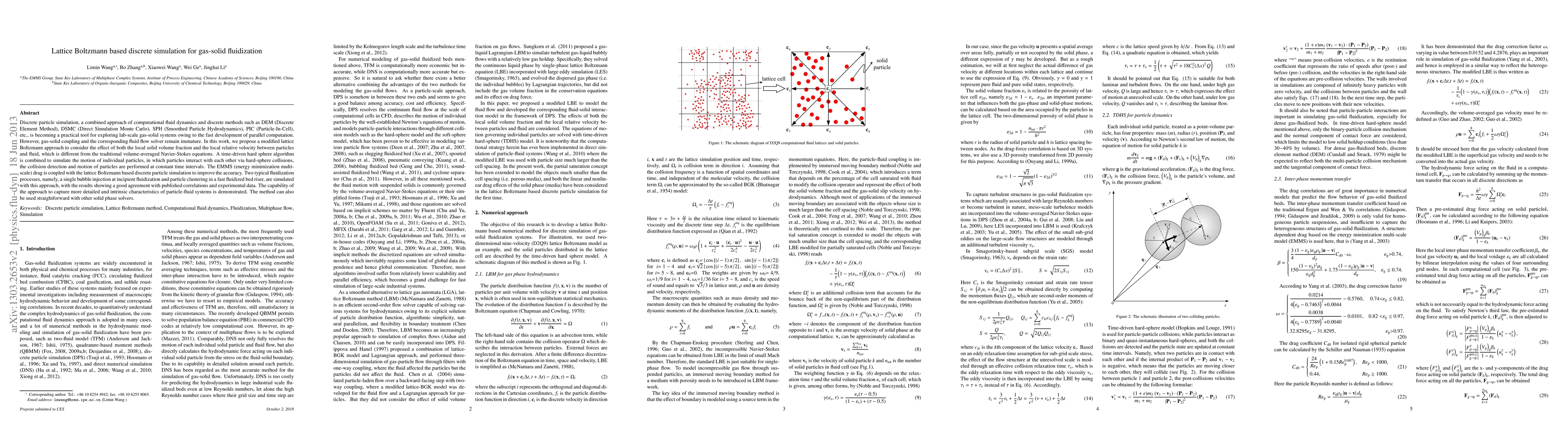 This paper proposes a lattice Boltzmann-based discrete simulation for gas-solid fluidization, integrating a modified approach to account for local solid volume fraction and relative particle-fluid velocity. The method combines a time-driven hard sphere algorithm with EMMS drag to simulate particle interactions, demonstrating accuracy through simulations of bubble injection and particle clustering, showing good agreement with experimental data.